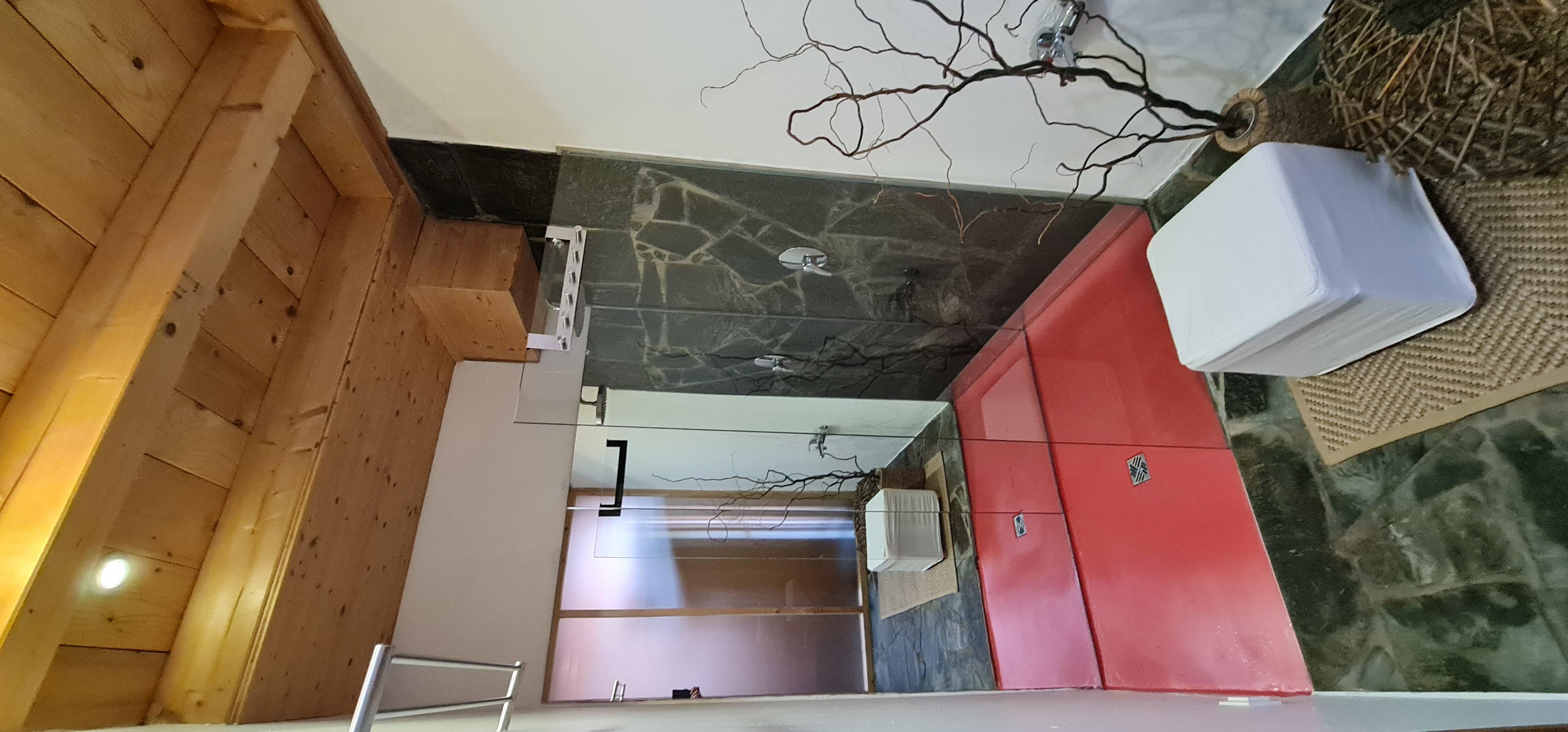 Alle Böden im Erdgeschoss sind mit gebrochenem Naturstein belegt. Im Duschbereich liegt ein warmer Holzrost.