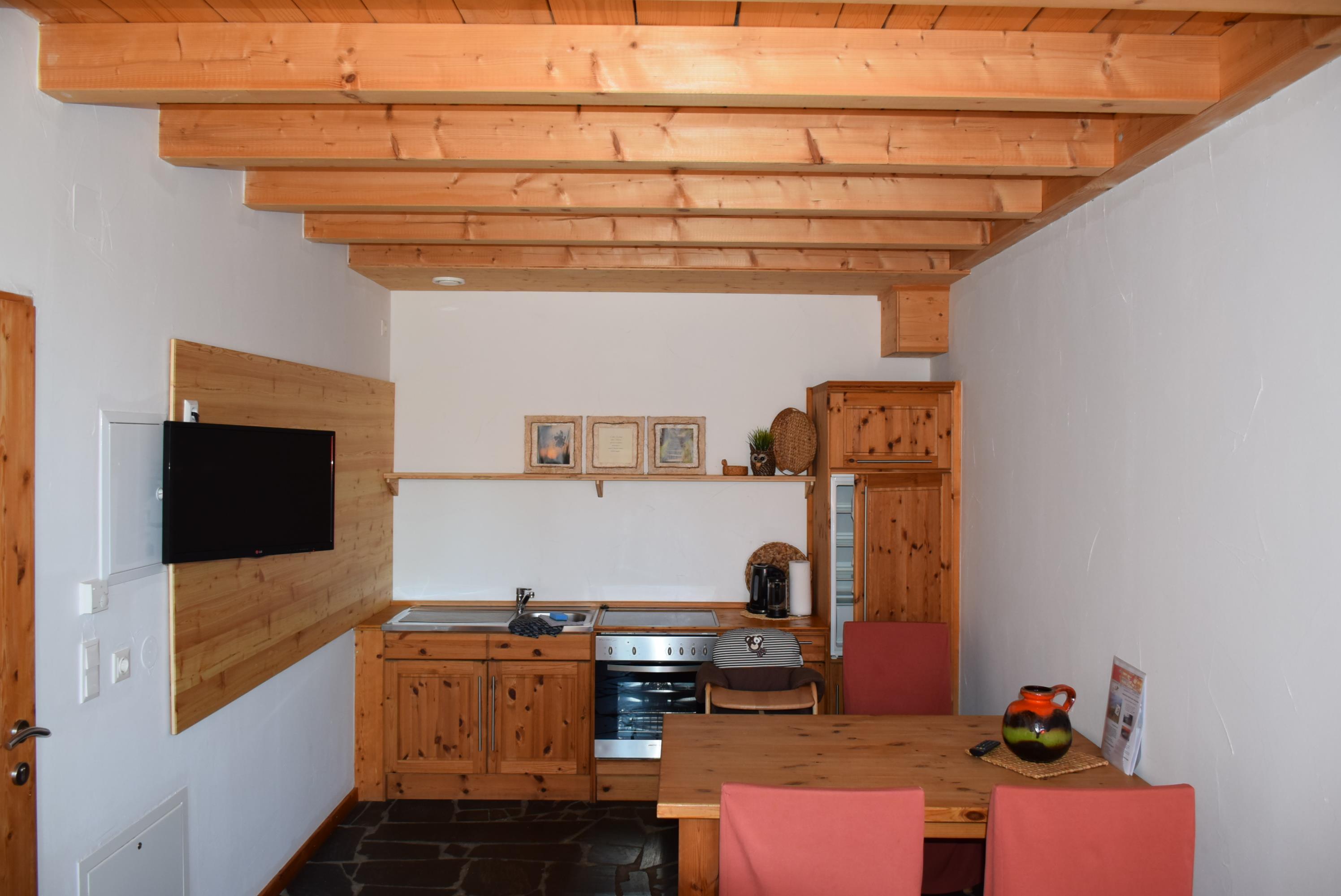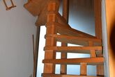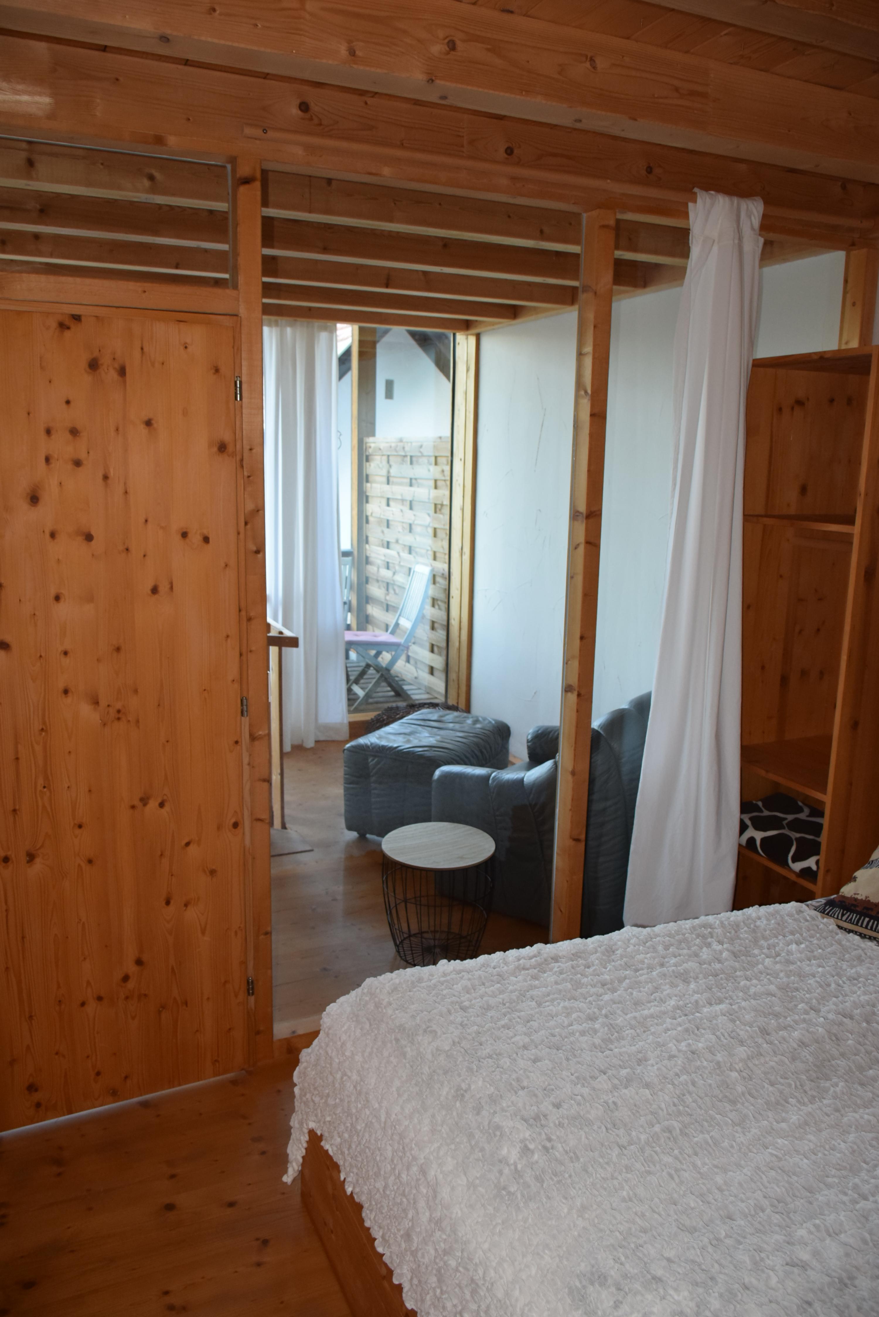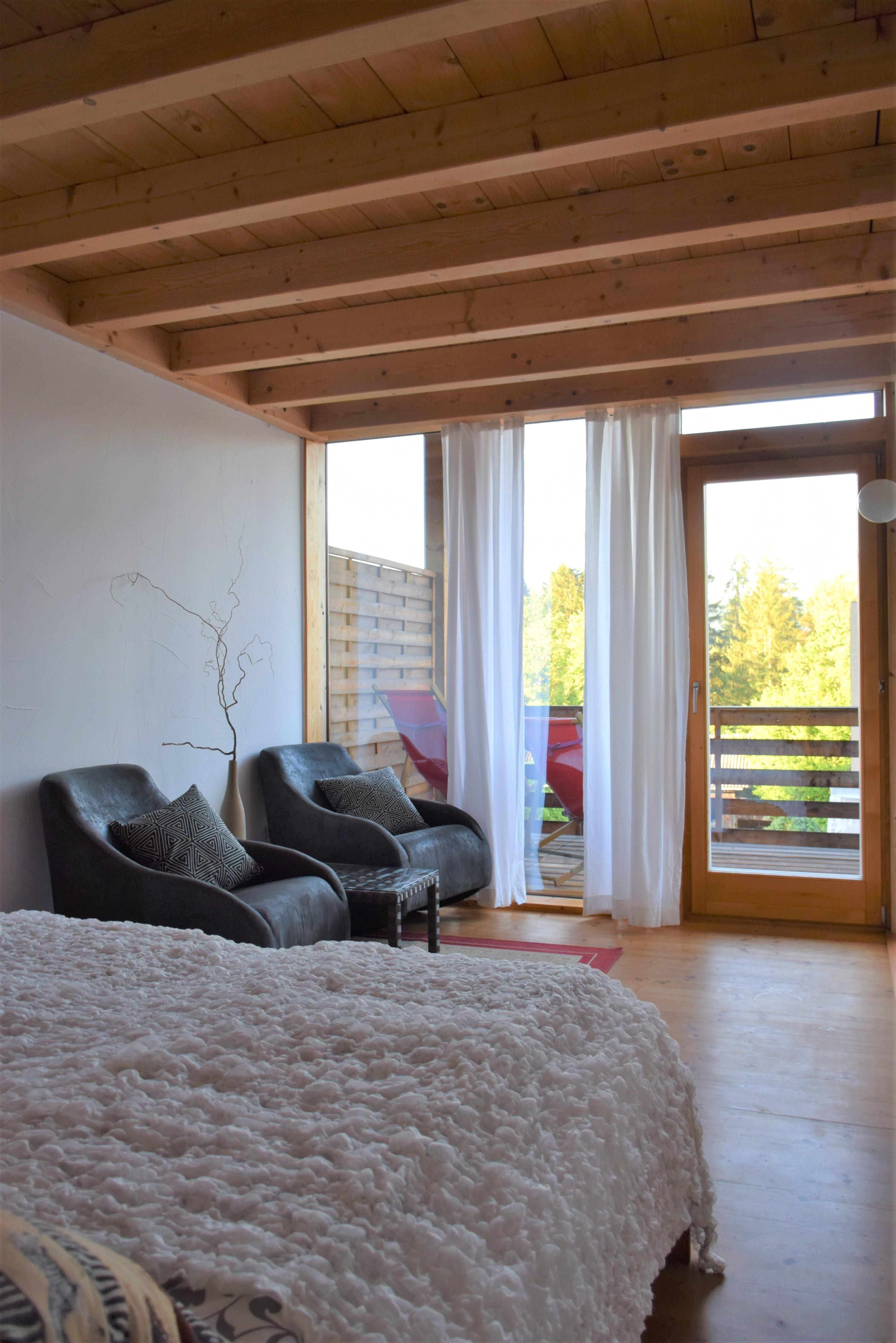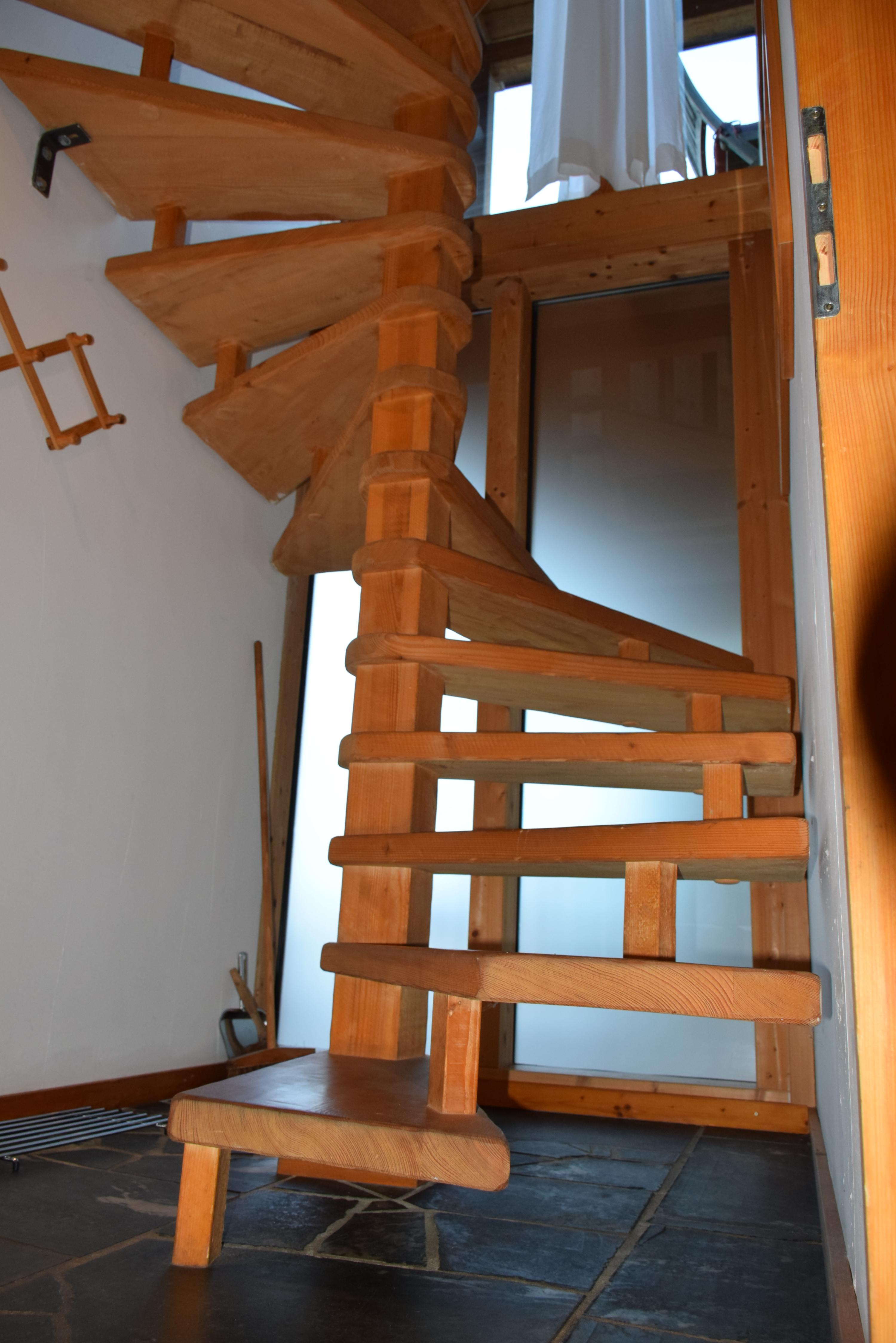 Die Holztreppe dreht sich zu zwei Doppelbettzimmern im Obergeschoß. Über den verglasten Vorraum haben Sie eine geschützte Aussicht auf die Terrasse und die dahinter liegende Bergwelt.
