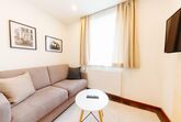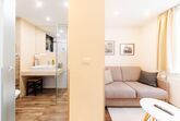 Schlafzimmer mit Flath TV und Desingbild , Verbindungstüre zu Wohnbereich mit 2. Flath TV und hochwertiger Hotelcouch ( ausziehbar mit Klatschaumatratze). Duschbereich im modernen Design mit Riesen Spiegel - Glas und Designbildern.