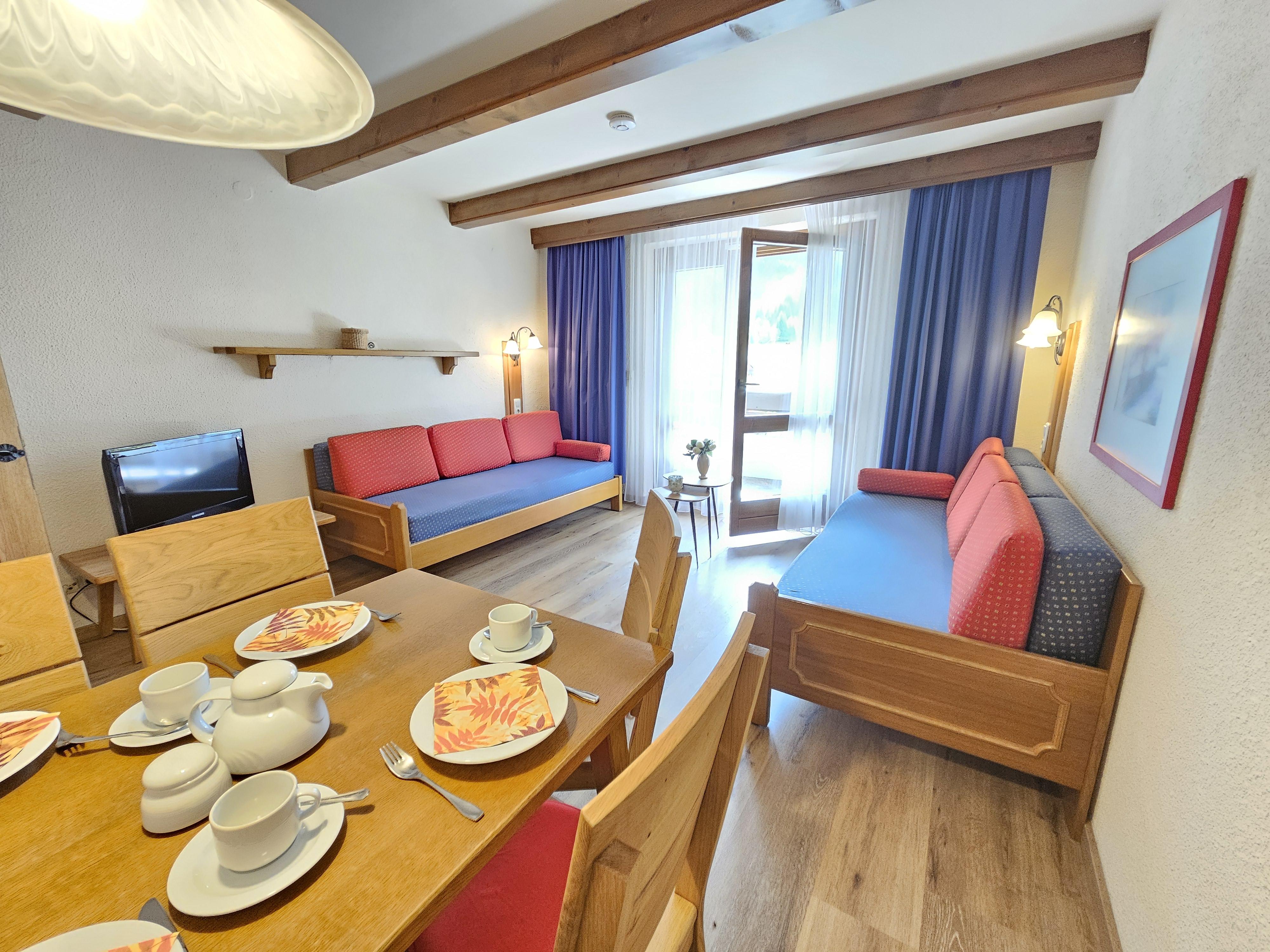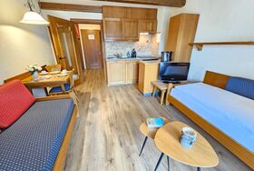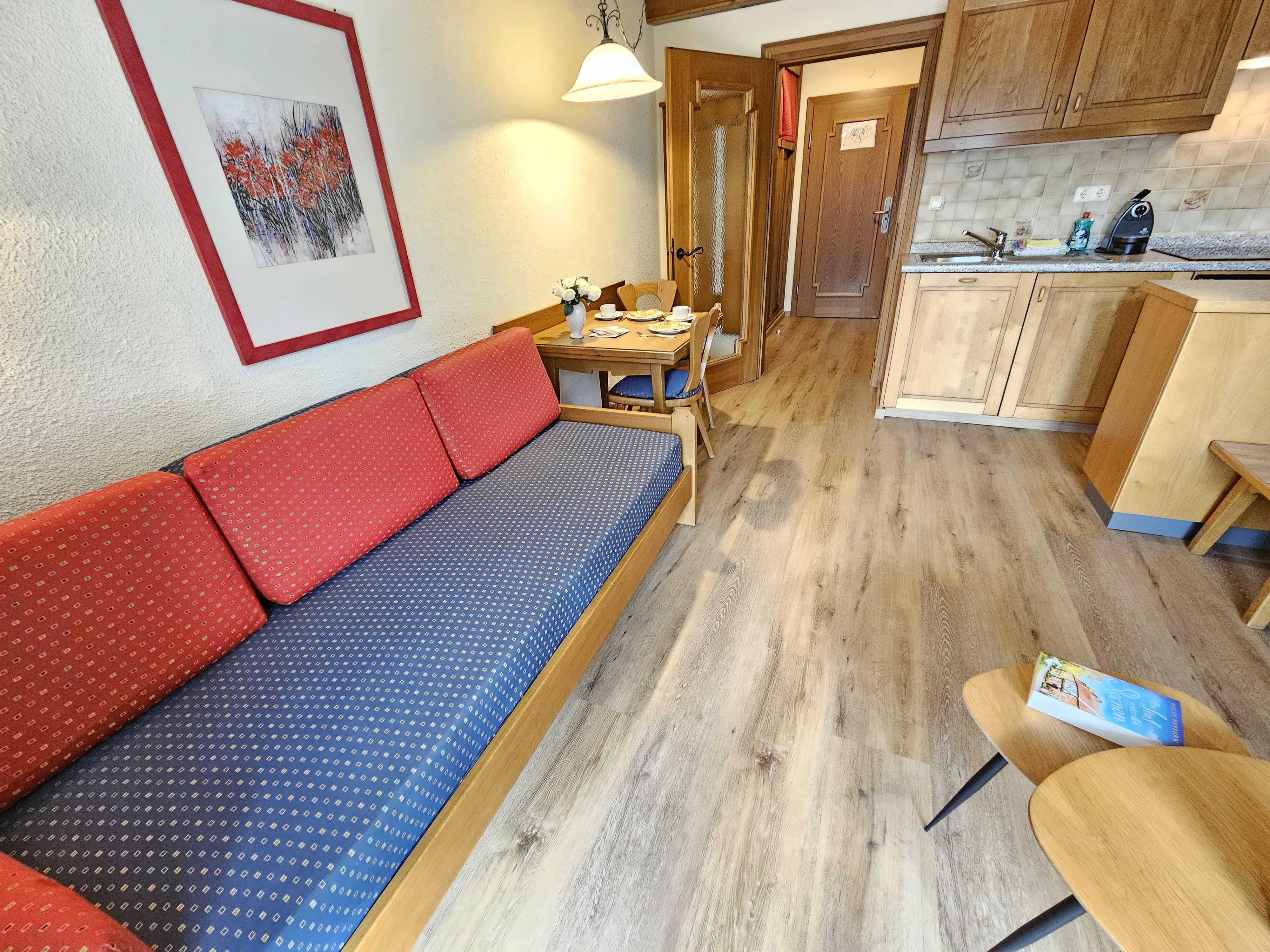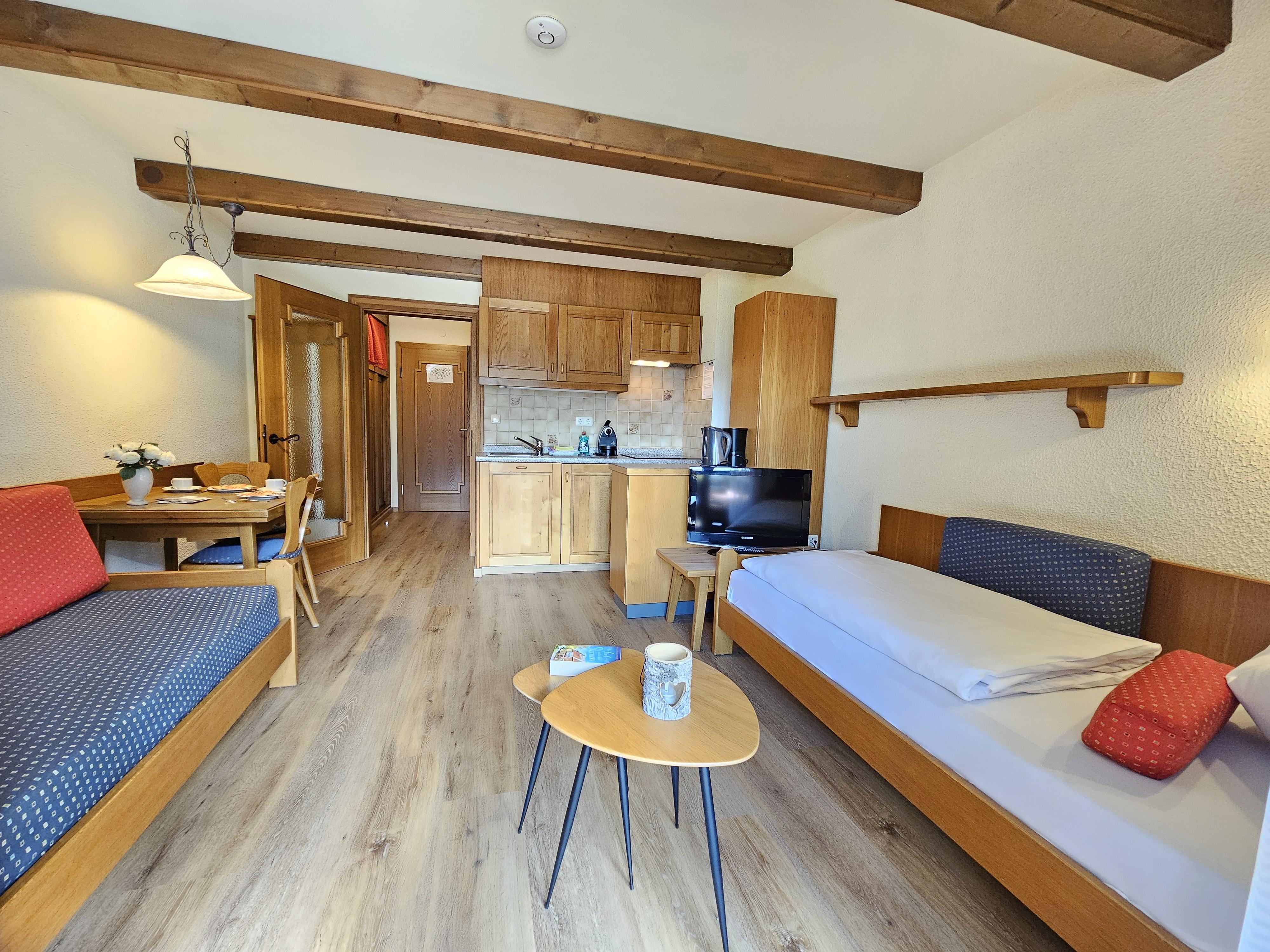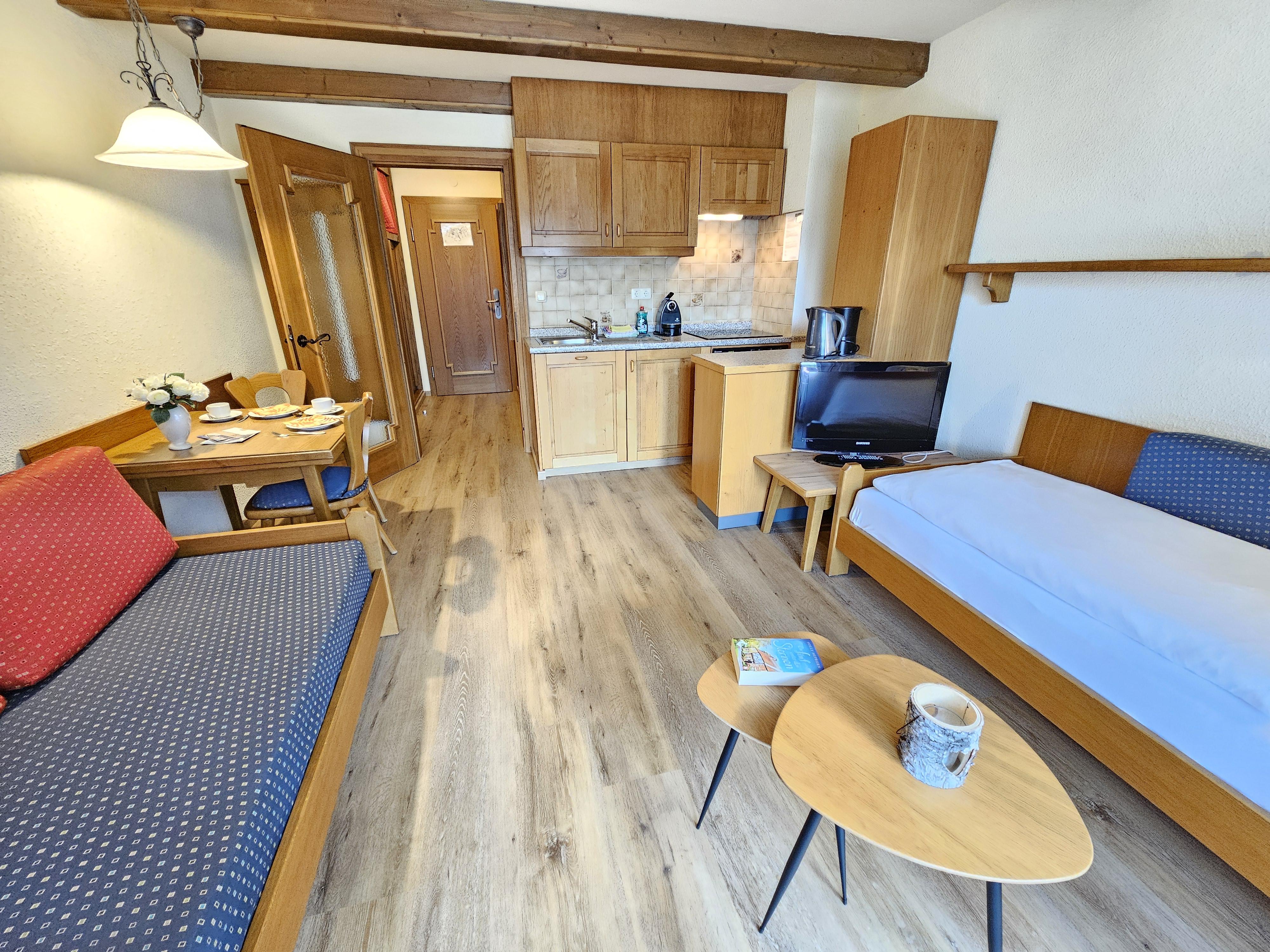 Das Apartment Typ Mono mit einem großen Wohn-Schlafzimmer mit 2 Single Betten, Küche und Esstisch umfasst ca. 30 m² mit Terrasse oder Balkon. Er ist auf Anfrage auch mit Doppelbett zu haben. Standard bei Buchung über das System sind die Singlebetten.
