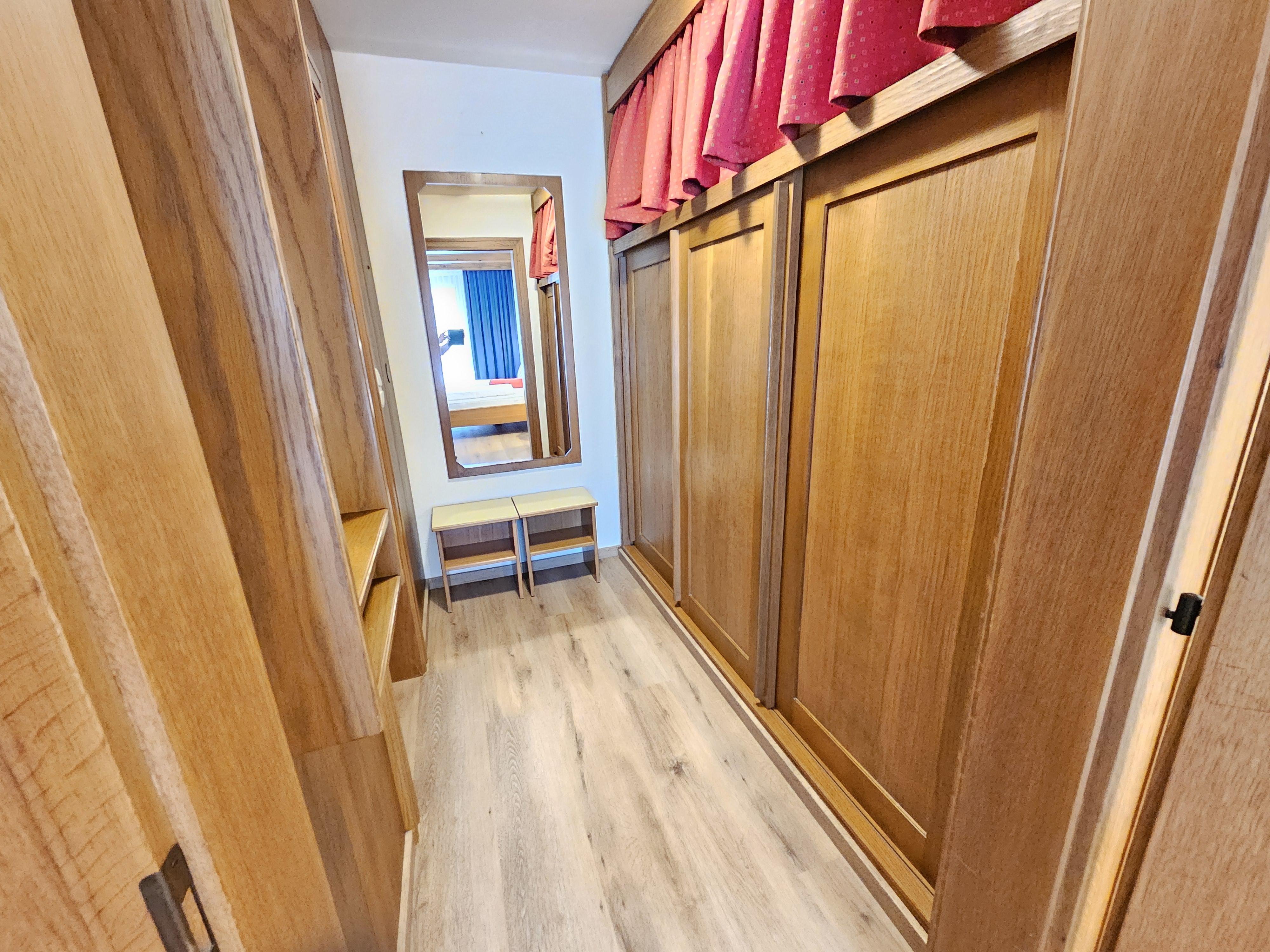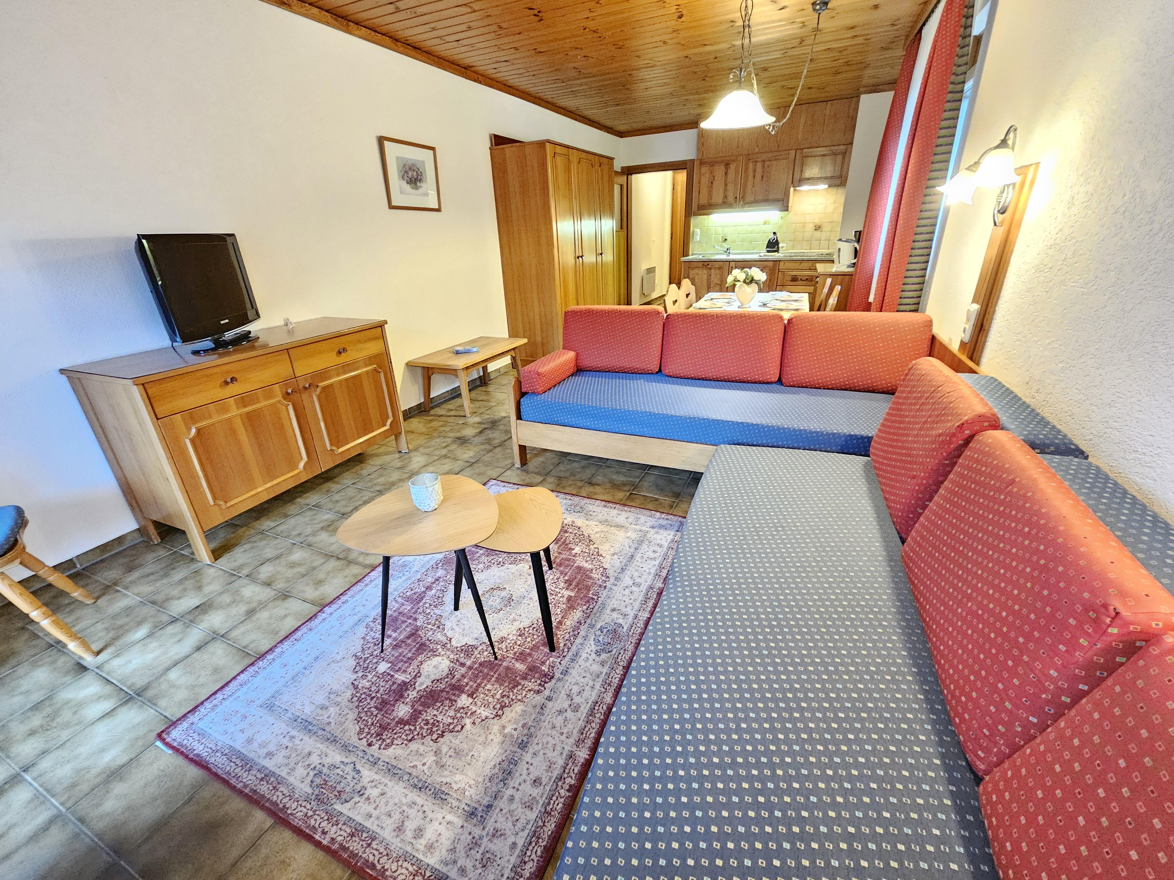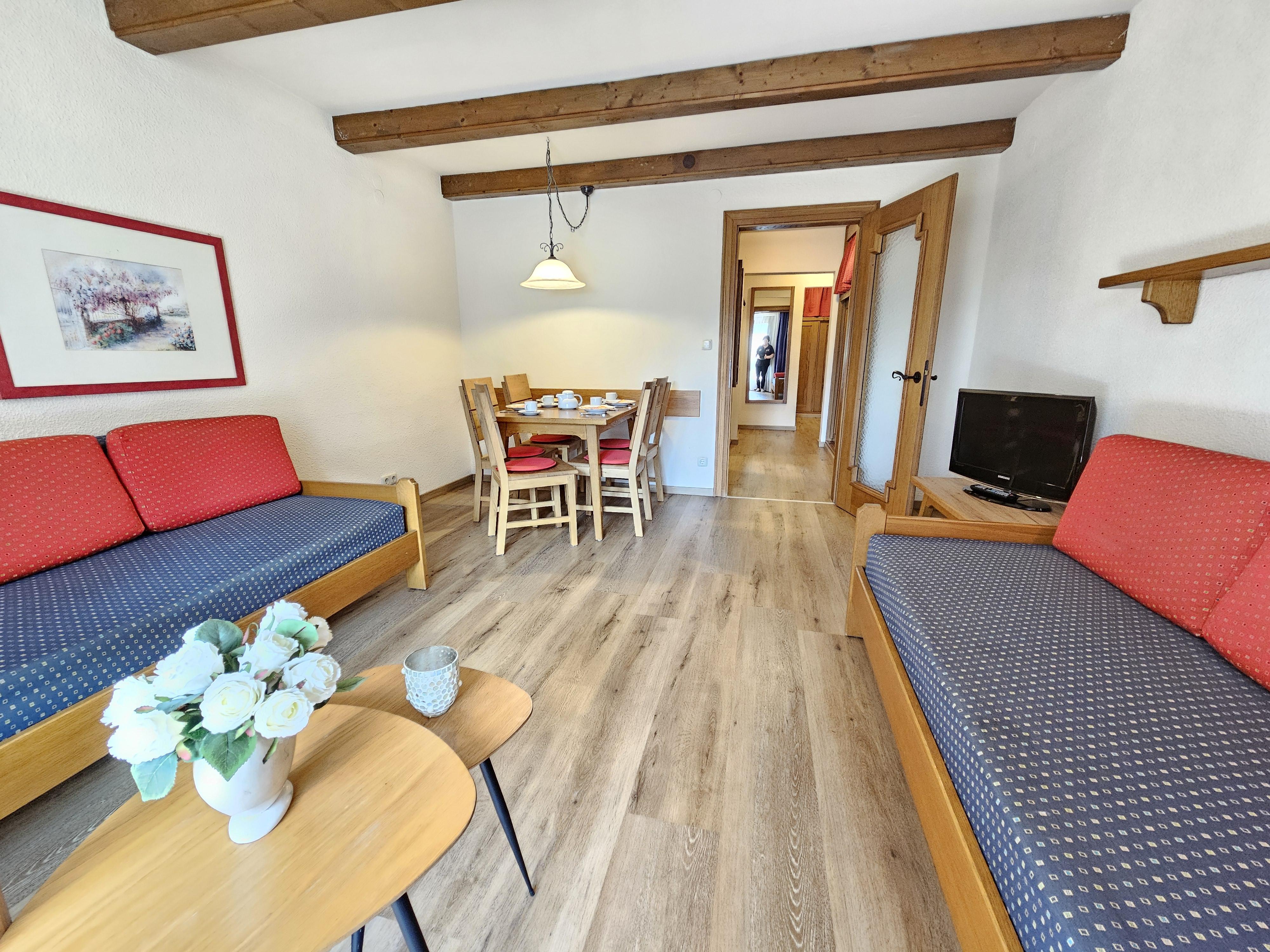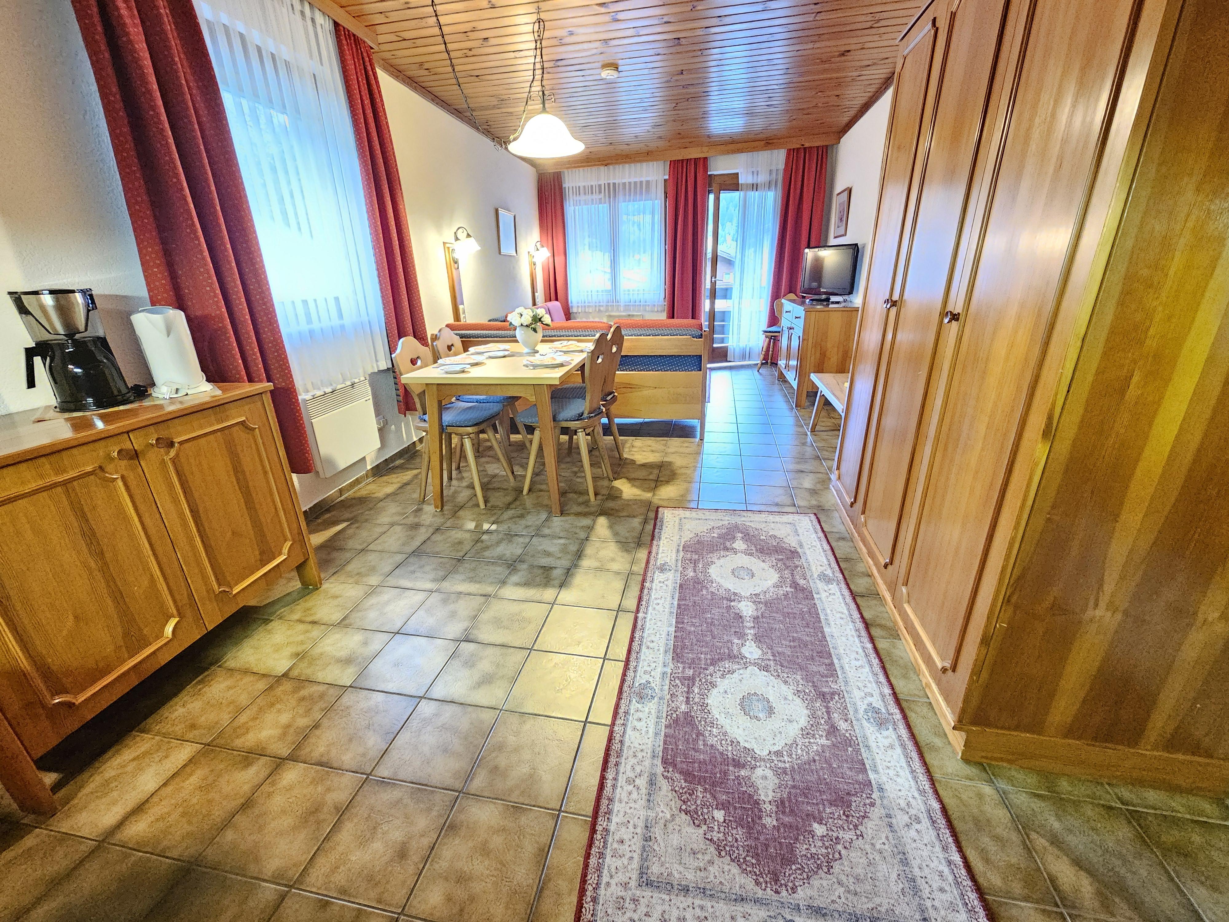 Das Apartment Typ Mono mit einem großen Wohn-Schlafzimmer mit 2 Single Betten, Küche und Esstisch umfasst ca. 30 m² mit Terrasse oder Balkon. Er ist auf Anfrage auch mit Doppelbett zu haben. Standard bei Buchung über das System sind die Singlebetten.