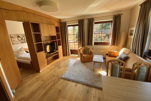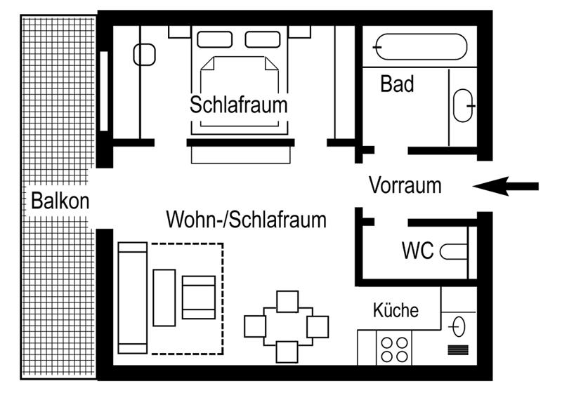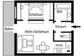 2 bis 4 Personen Appartement mit getrenntem Schlafraum, Wohnraum mit ausziehbarer Couch, Küche mit Geschirrspüler, Dusche, getrenntes WC, SAT-TV, Telefon und Balkon. Appartement Typ B ohne Balkon mit einer Preisreduzierung von Euro 15,-- pro Tag auf Anfrage buchbar.