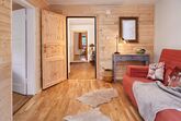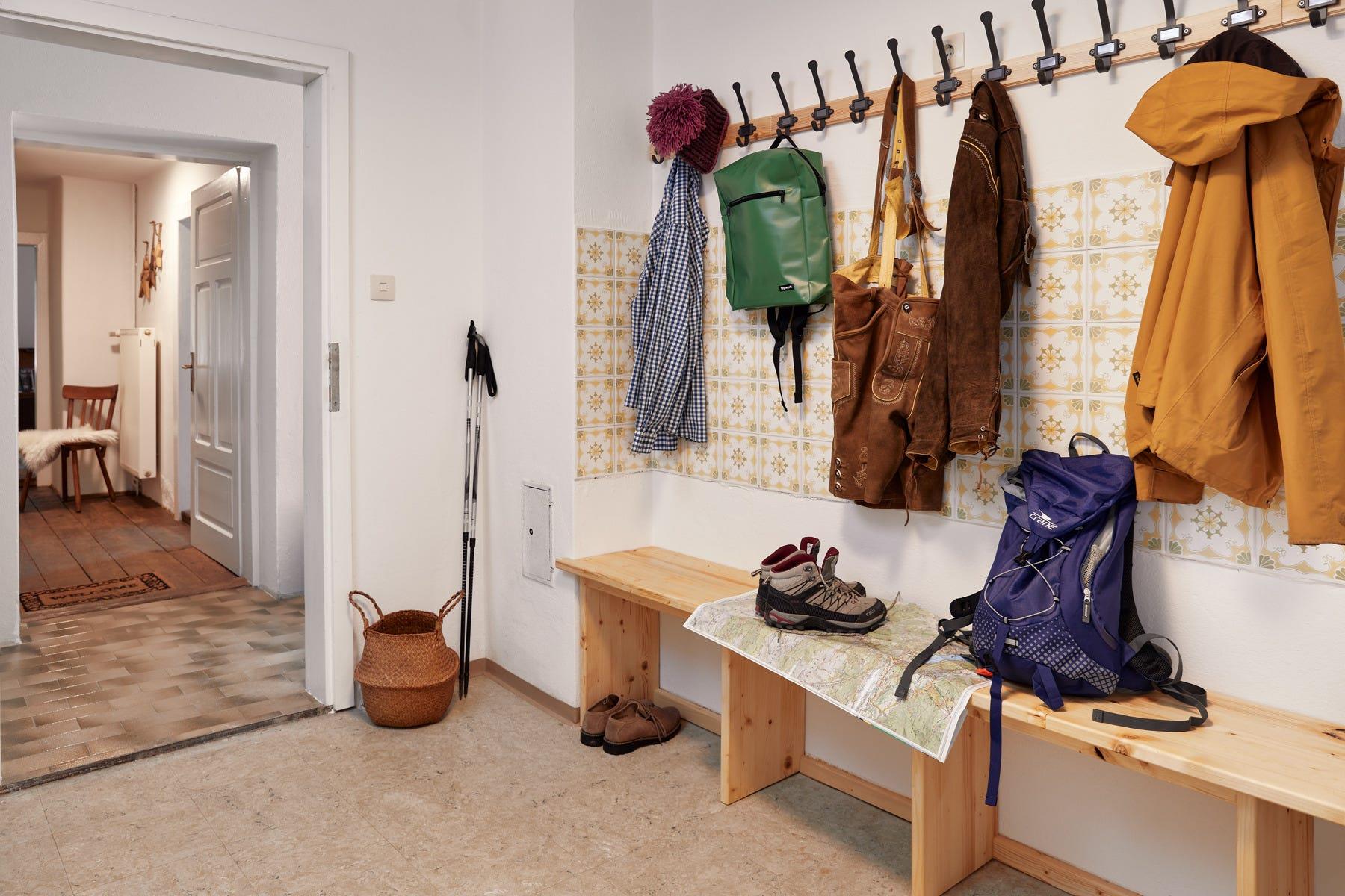 Großzügiger Garderobenraum mit Sitzbank aus Holz.