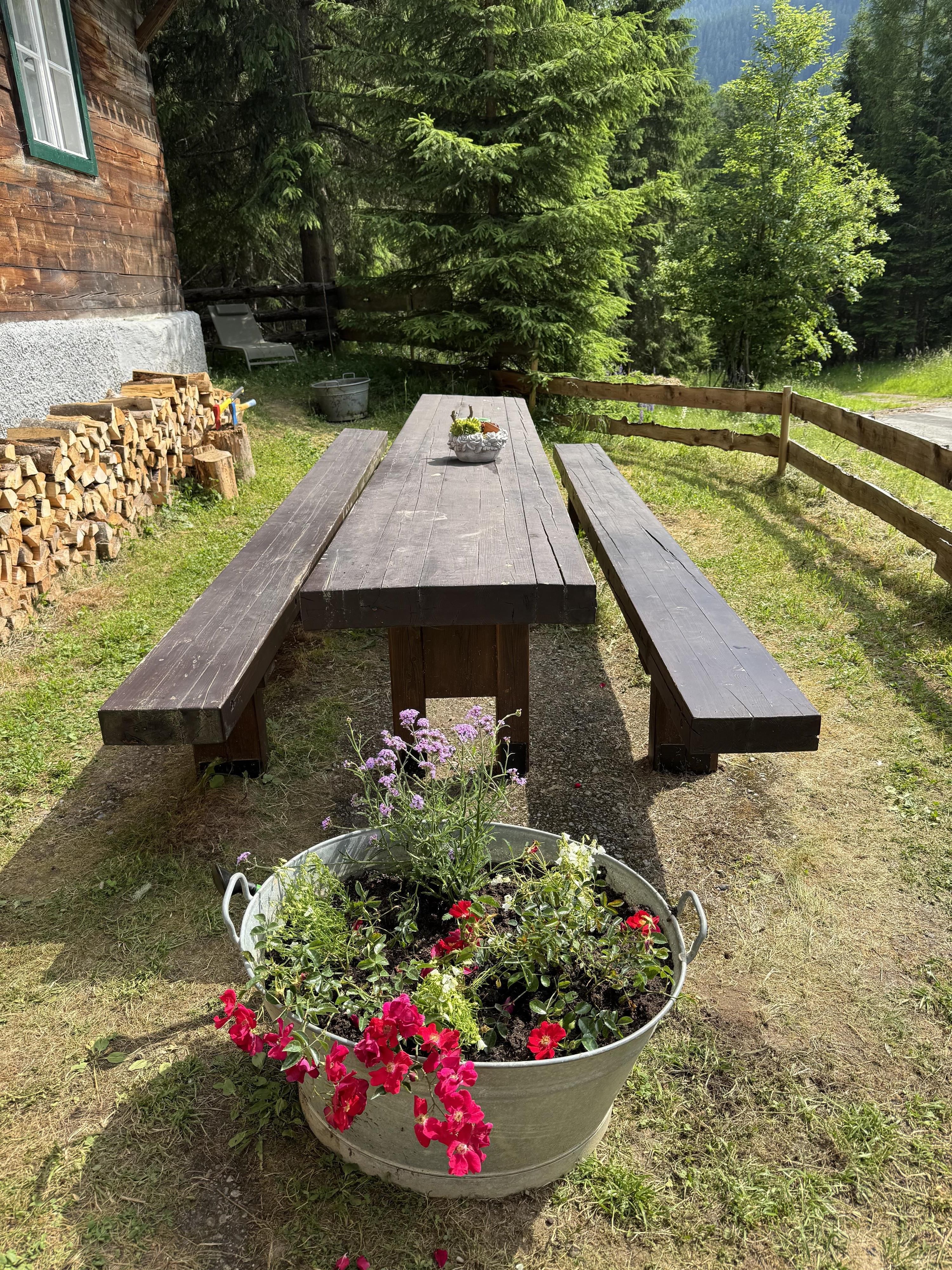 Grill und Tisch mit Bank auf der Wiese vor der Nockstern Hütte.