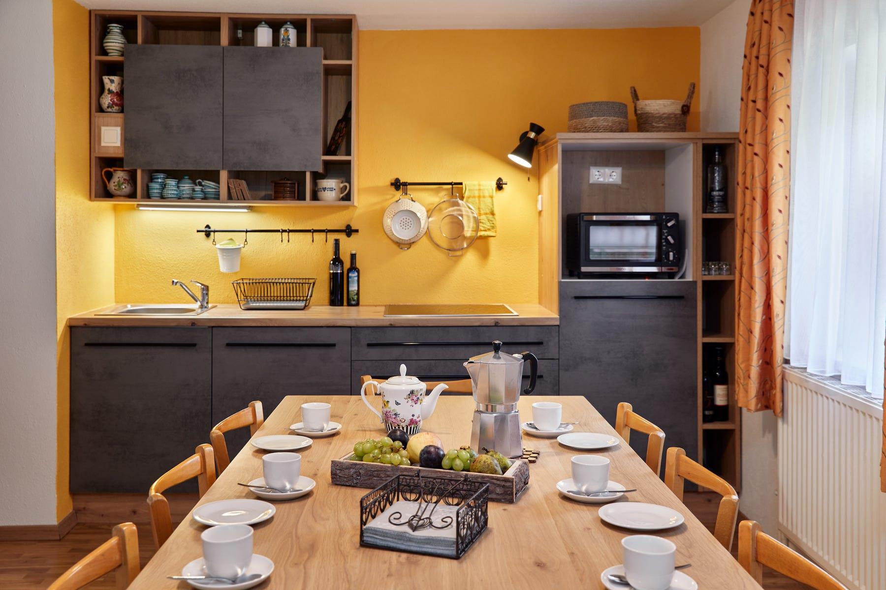 Gemütliche, moderne Küche im Obergeschoss. Sehr gut ausgestattet mit Geschirrspüler, Backofen, Wasserkocher, Kaffeemaschine & was das Herz begehrt.