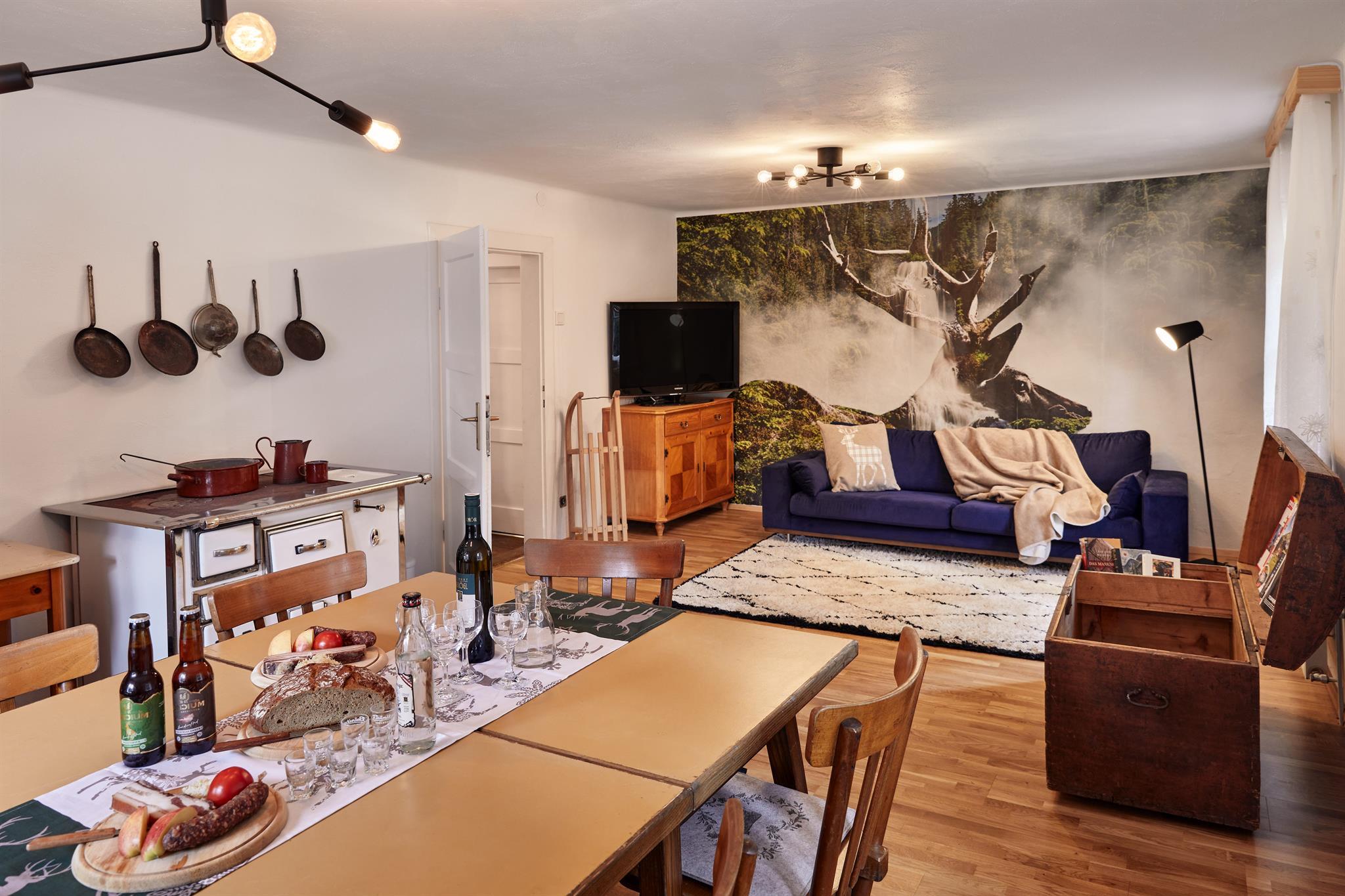 Gastfreundliche Stube mit TV, Holzherd für echtes Hüttenfeeling, Kaffeemaschine mit Kapseln, Kühlschrank und Couch.