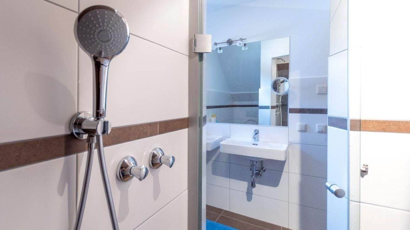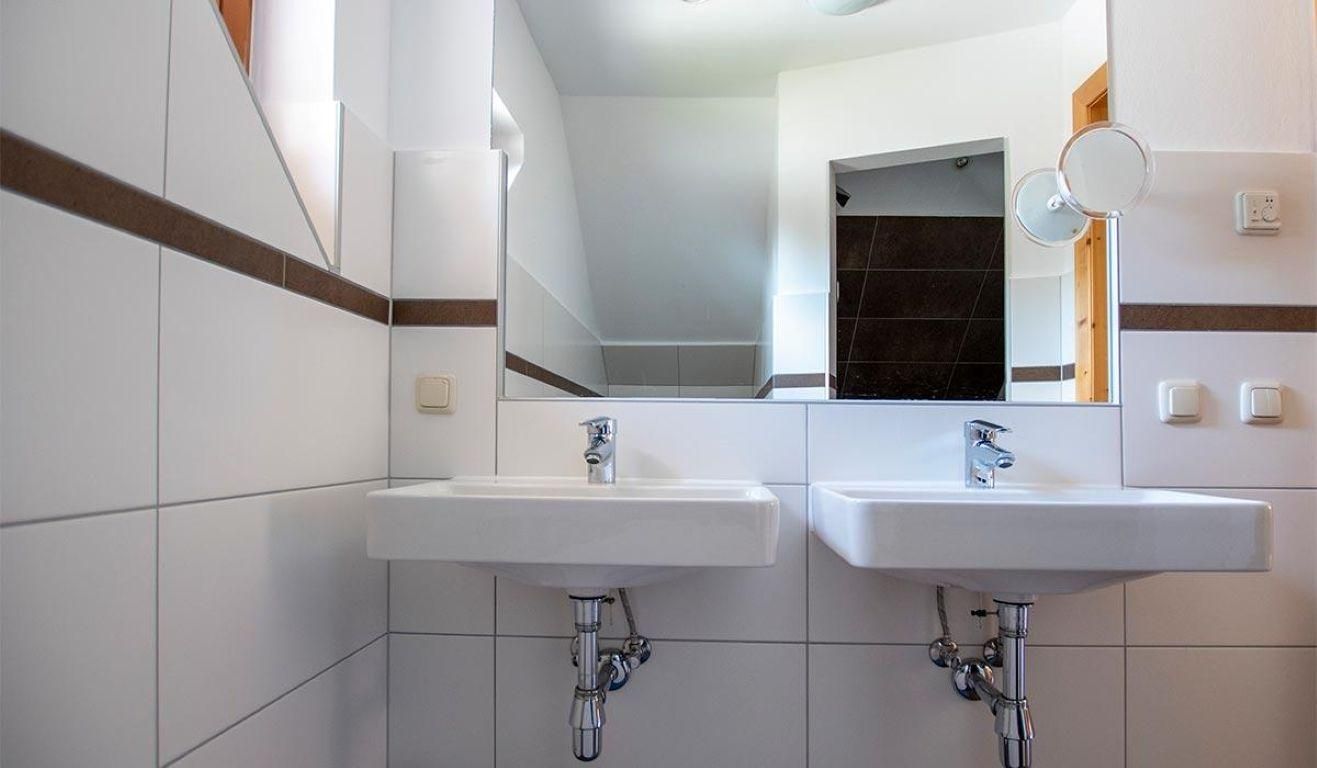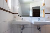 • Badezimmer mit Dusche, WC und zwei Waschbecken