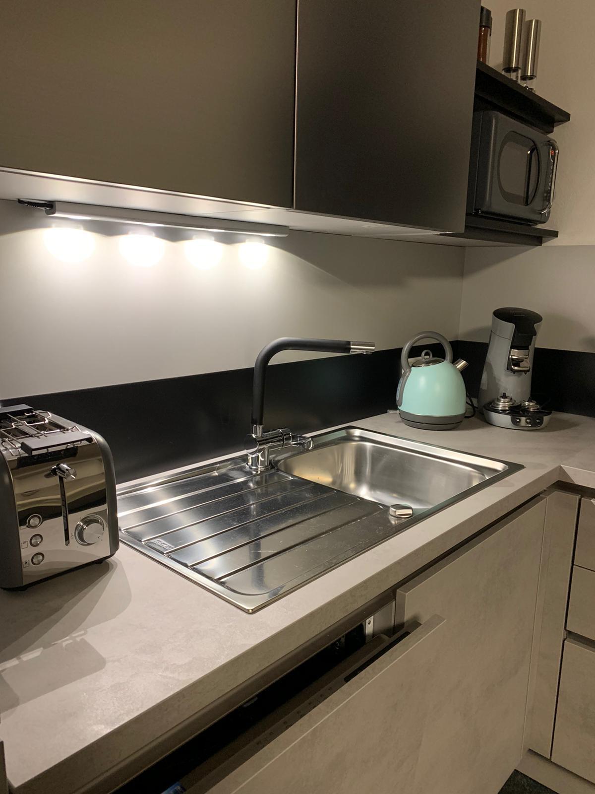 Neben dem Kochgeschirr ist noch Toaster , Wasserkocher und Microwelle vorhanden.