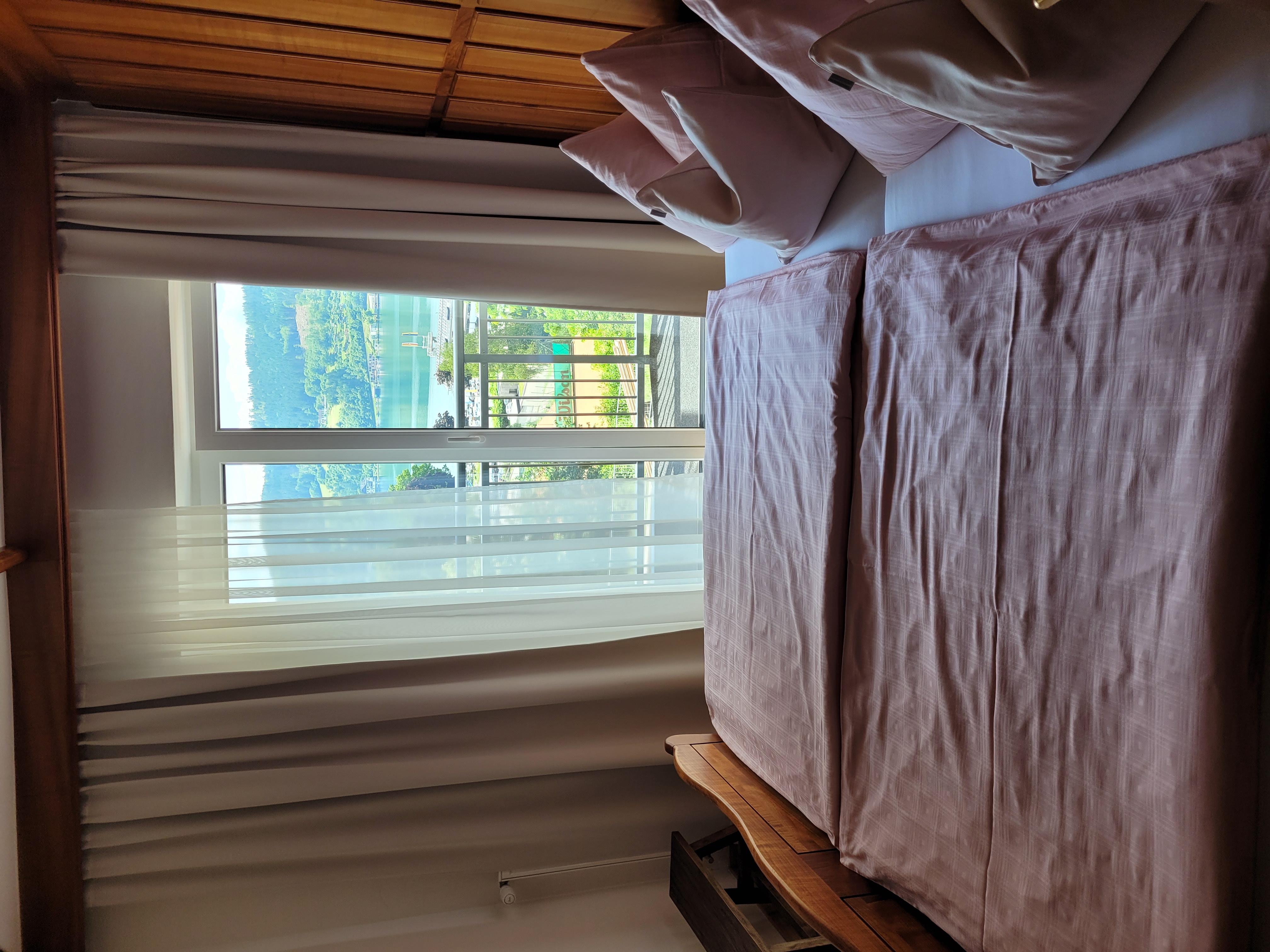 Das Schlafzimmer verfügt neben einem Doppelbett über zwei Schränke mit Schiebe - bzw. Drehtüren.