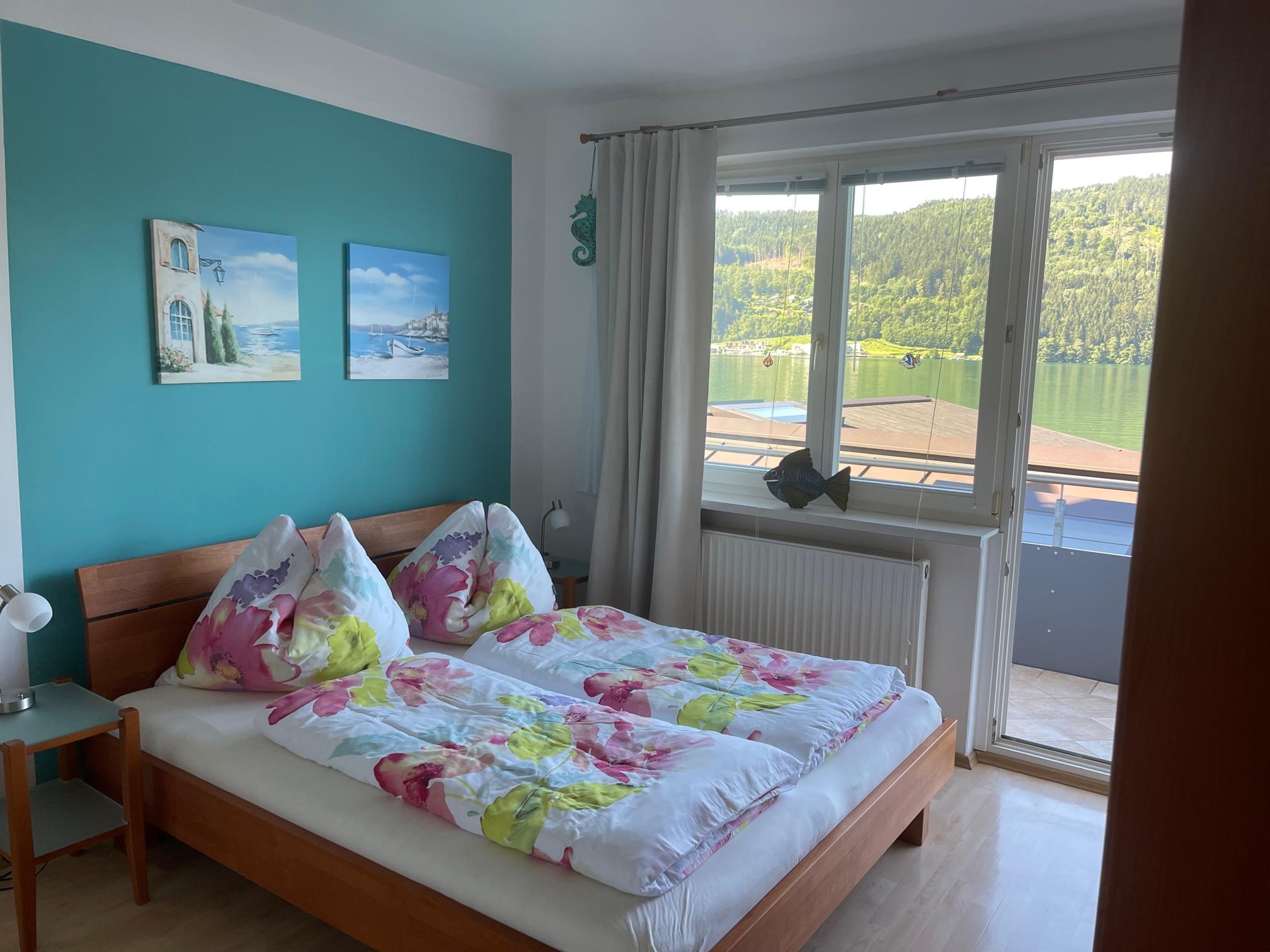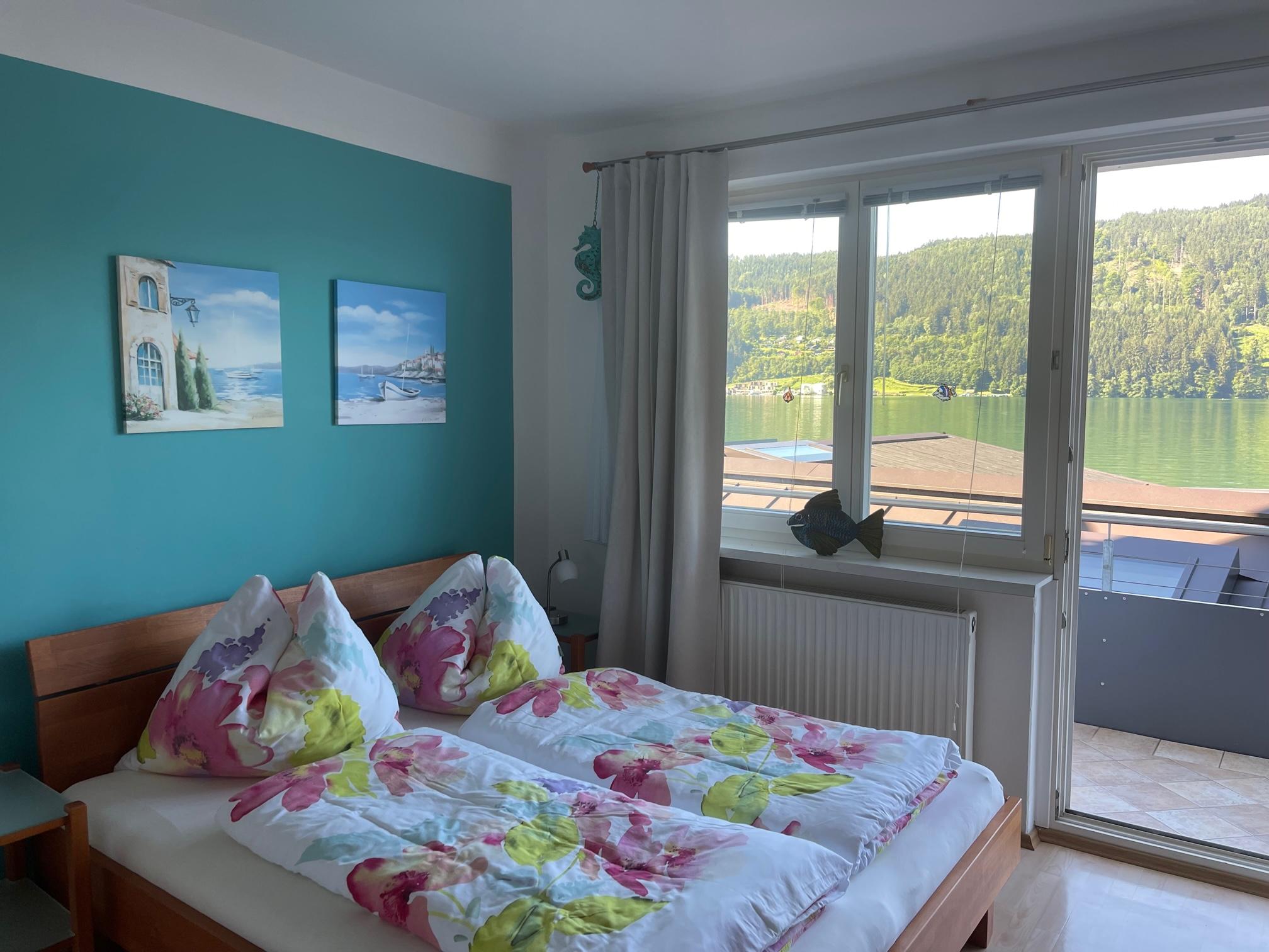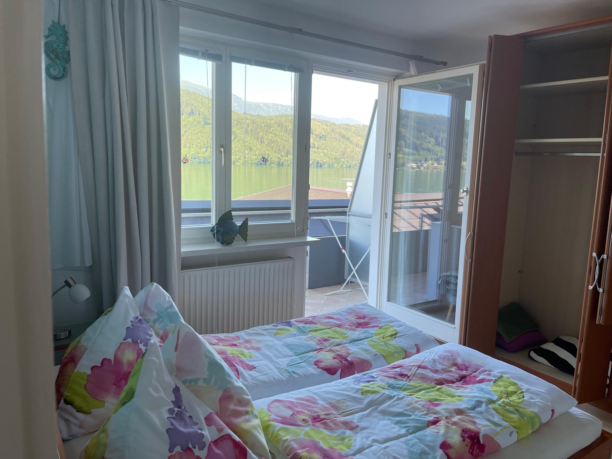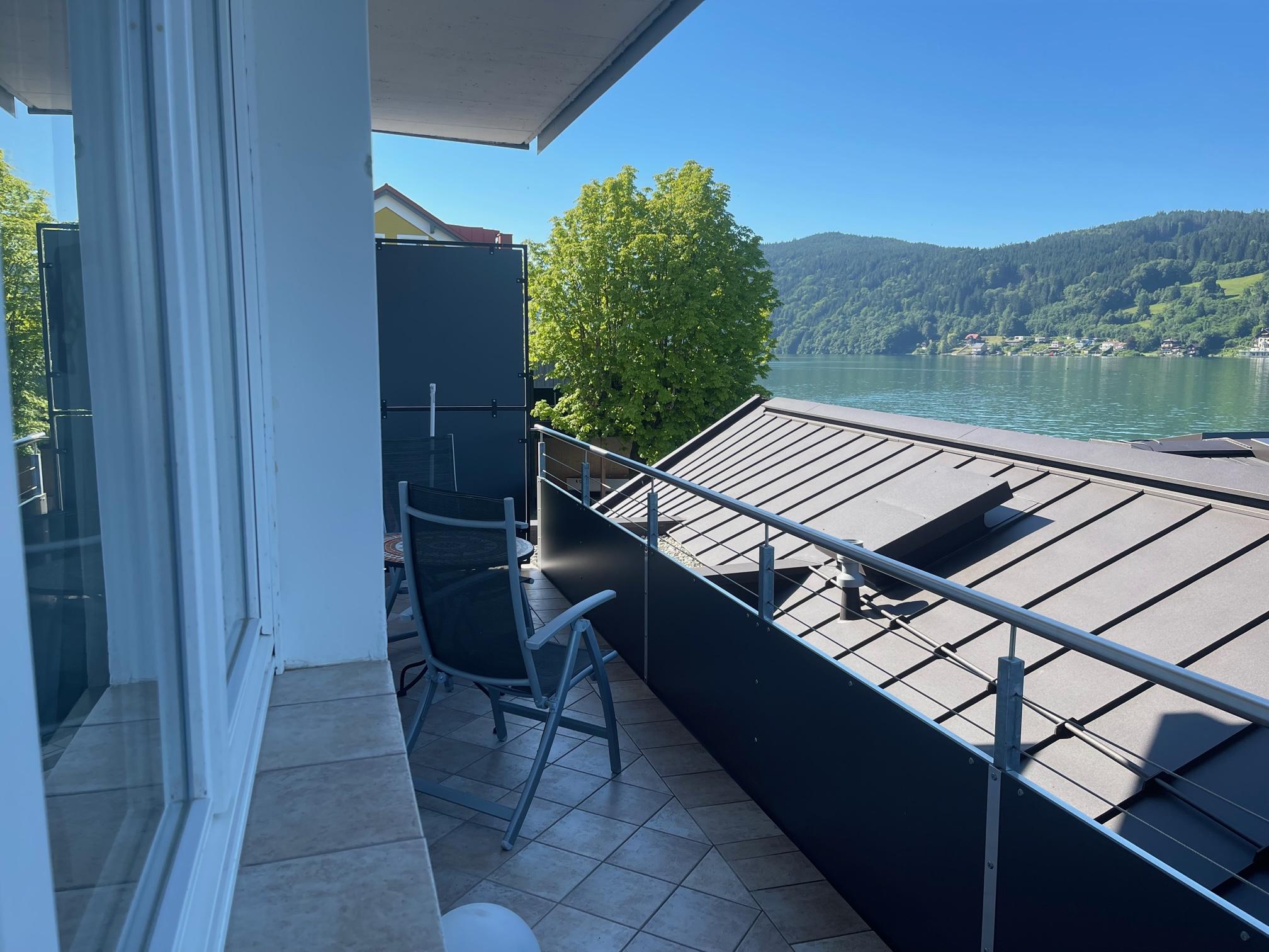 Genießen Sie entspannte Stunden auf dem Balkon mit herrlichem Seeblick – ausgestattet mit gemütlicher Sitzgelegenheit und Sonnenschirm.