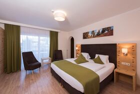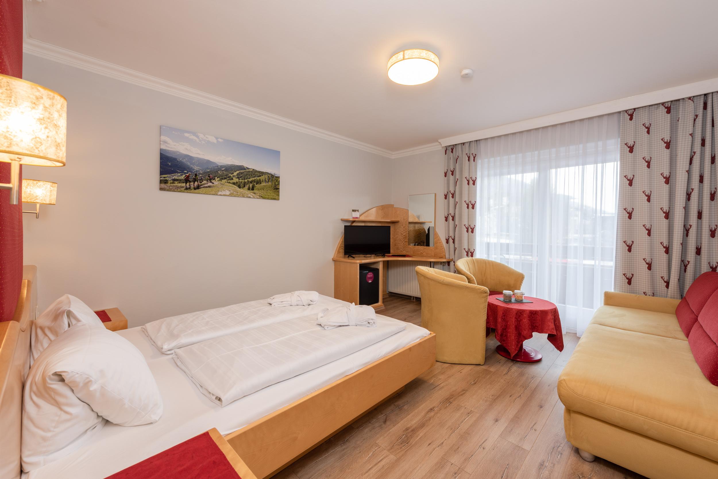 Doppelzimmer Zirbe-Birke Ca. 22 m² (für 1 bis 2 Personen), Ostbalkon oder Loggia, Gemütlicher Schlafraum und Wohnecke, Safe, Badezimmer mit Dusche und WC, Kosmetikspiegel, Föhn, Bademantel, Wellness-Korb, GRATIS WLAN