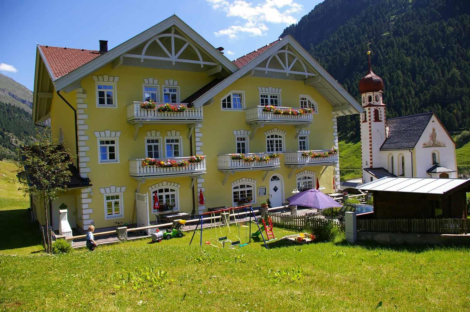 Appartementhaus mit Charme am Ortsanfang von Vent. Komfortable, helle Ferienwohnungen für 2-6 Personen im Tiroler Stil mit Kachelofen, Holzfußboden, entweder mit Balkon oder Wintergarten - auch für Allergiker geeignet. Gemütliche alte Gaststuben mit á la carte-Restaurant und Pizzeria im Haus, sowie großzügige Saunaanlage mit Sanarium und Fitnessbereich. Benützung von Hallenbad und Wellnessbereich im Hotel Post!