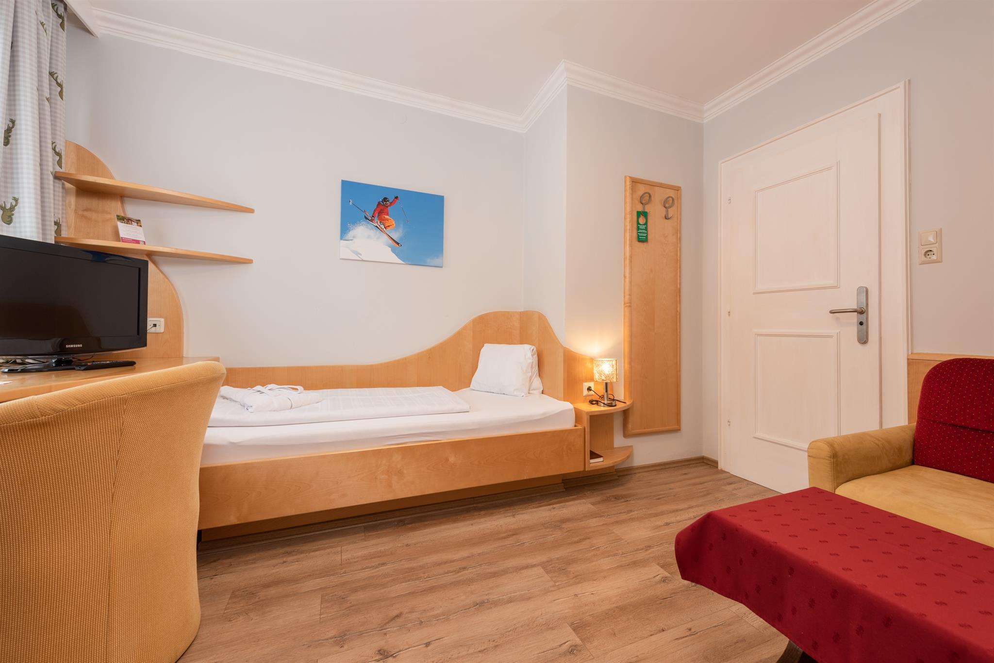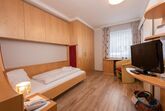 Einzelzimmer Ca. 15 m², Ohne Balkon, Gemütlicher Schlafraum und Sitzbereich, Kabel-TV, Safe, Badezimmer mit Badewanne oder Dusche und WC, Kosmetikspiegel, Föhn, Bademantel, Wellness-Korb, GRATIS WLAN