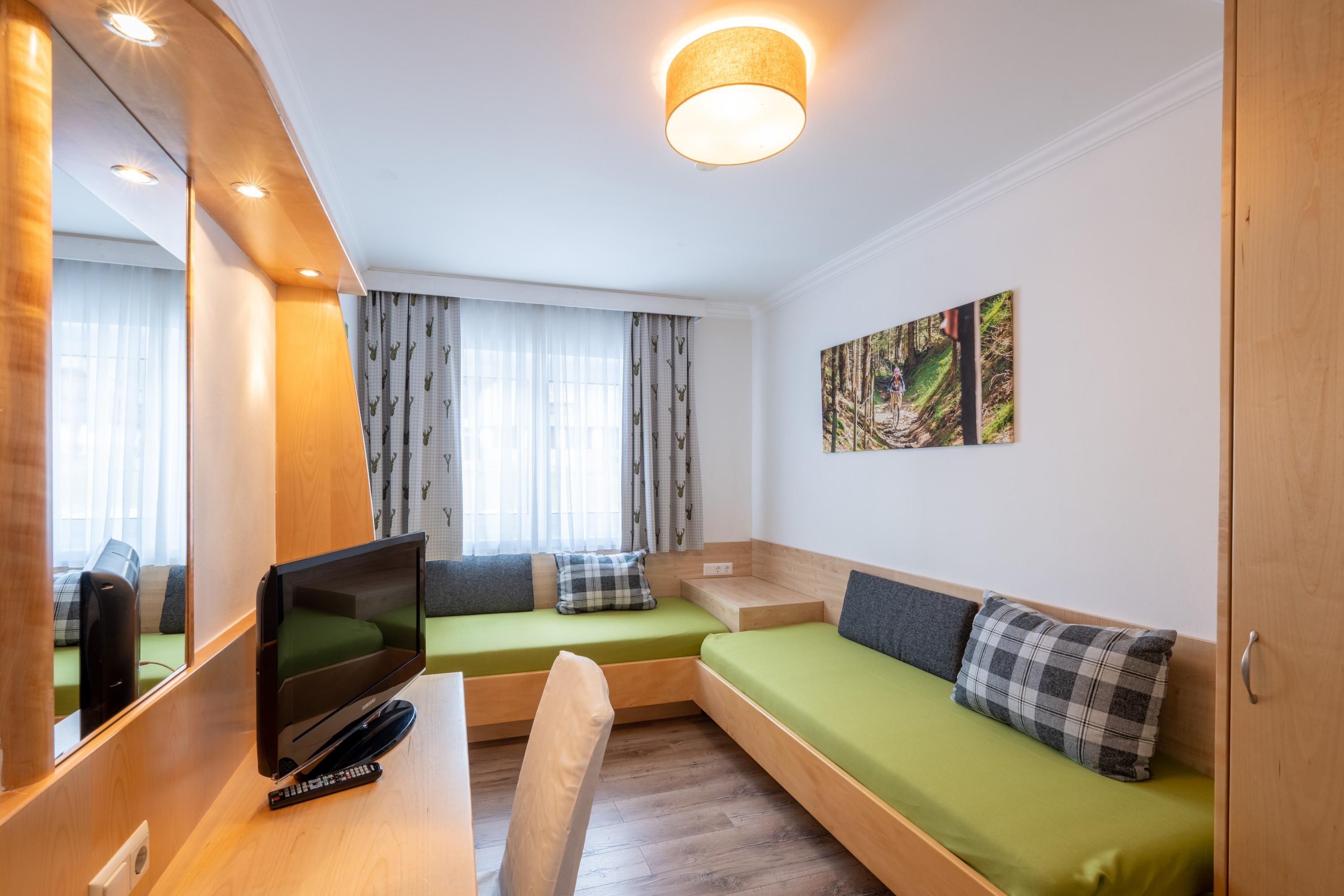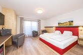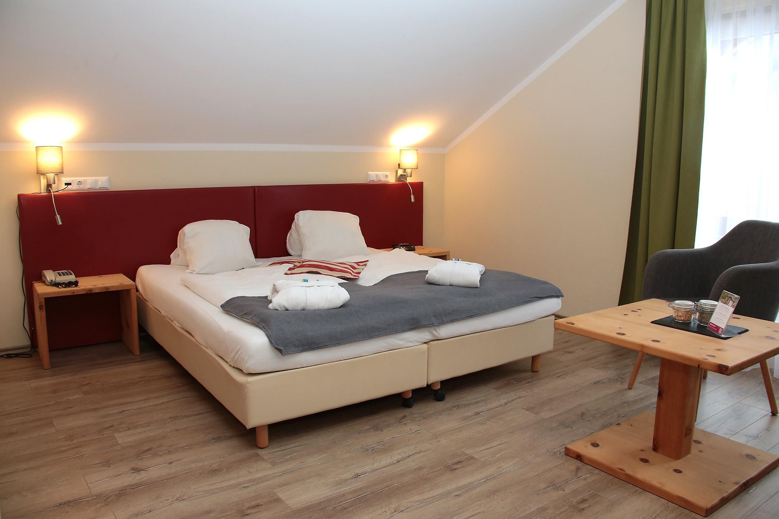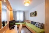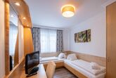 42m² zur Westseite, 1 x Schlafzimmer, 1 x Wohn-Schlafraum mit Ausziehcouch, Motto Schlafen unterm Himmelszelt bei Dunkelheit ist ein Sternenbild über dem Doppelbett ersichtlich. Einrichtung: mit hellen Möbeln und pastellfarbigen Stoffen, Eckcouchen(Zusatzaufbettung) oder/und Cocktailsesseln, Kabel-TV, Schreibtisch, Safe, Radio und Minibar, Westbalkon, Bad: WC und Bad, Fön, Kosmetik- Spiegel und Artikel, gefüllter Wellnesskorb mit Bademantel und Saunatücher,
