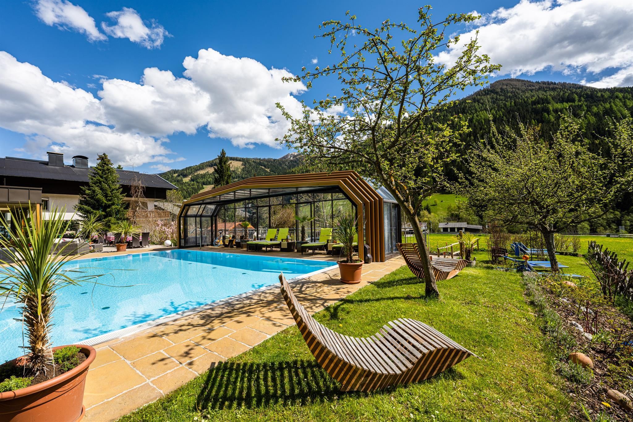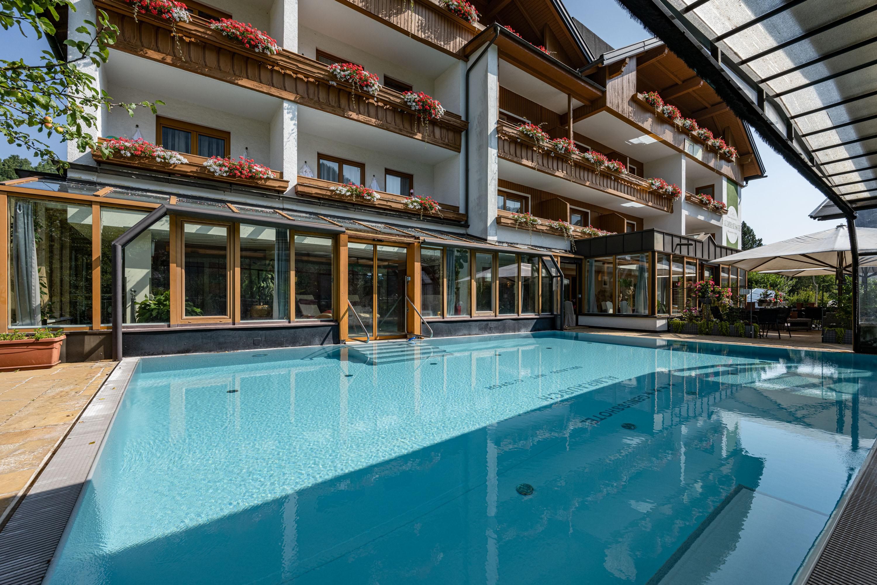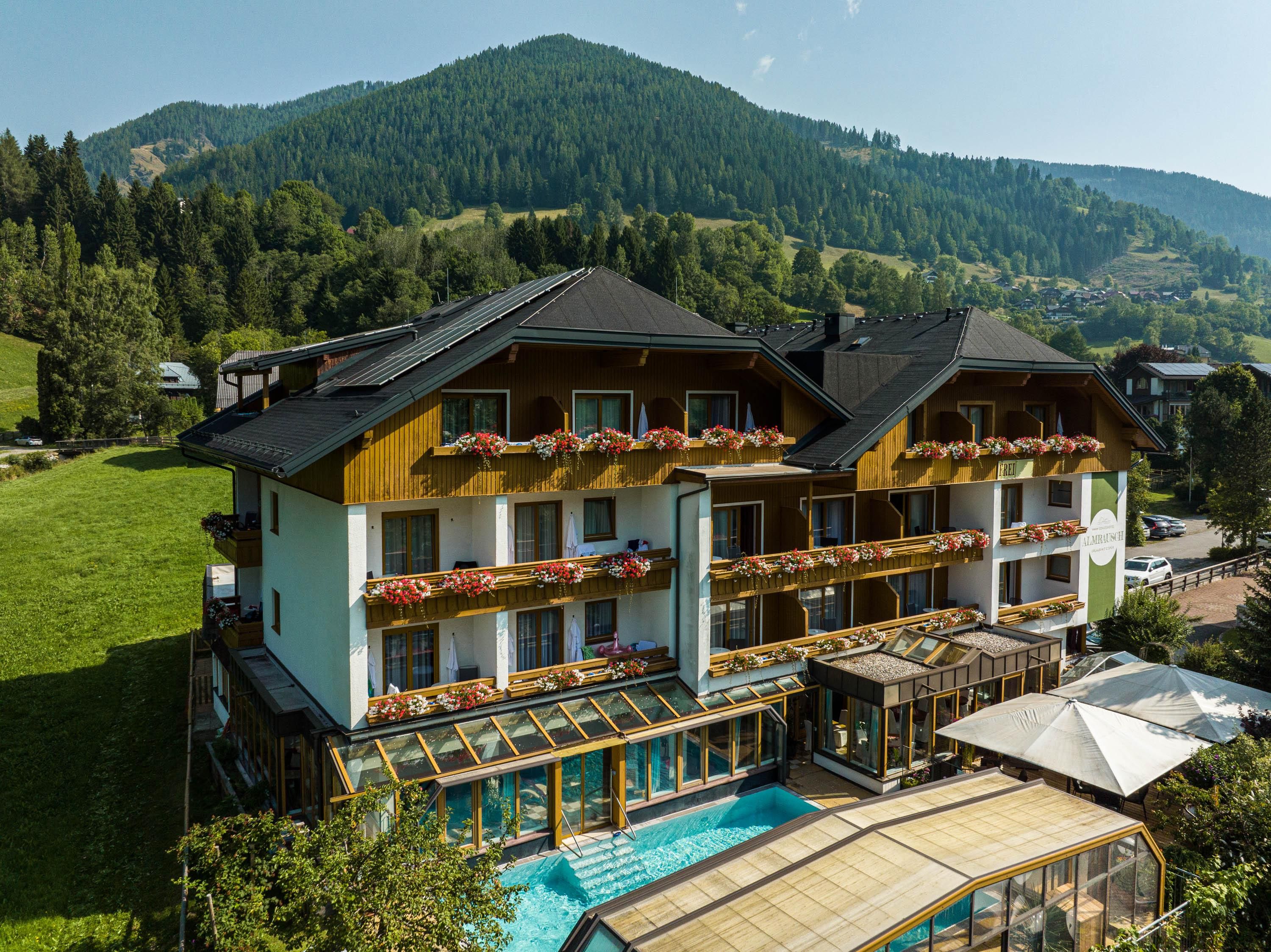 Willkommen im Hotel Almrausch mit der 500 Quadratmeter großen Wellnessoase auf zwei Ebenen. Freuen Sie sich auf jede Menge Relaxen, Energietanken und Kraftholen mit überdachtem, ganzjährig nutzbarem Pool (Sommer 29°C, Herbst/Winter 31°C), einer Saunaoase, verschiedenen Ruheräumen und bei wohltuenden Massagen. Sommerurlaub in Bad Kleinkirchheim