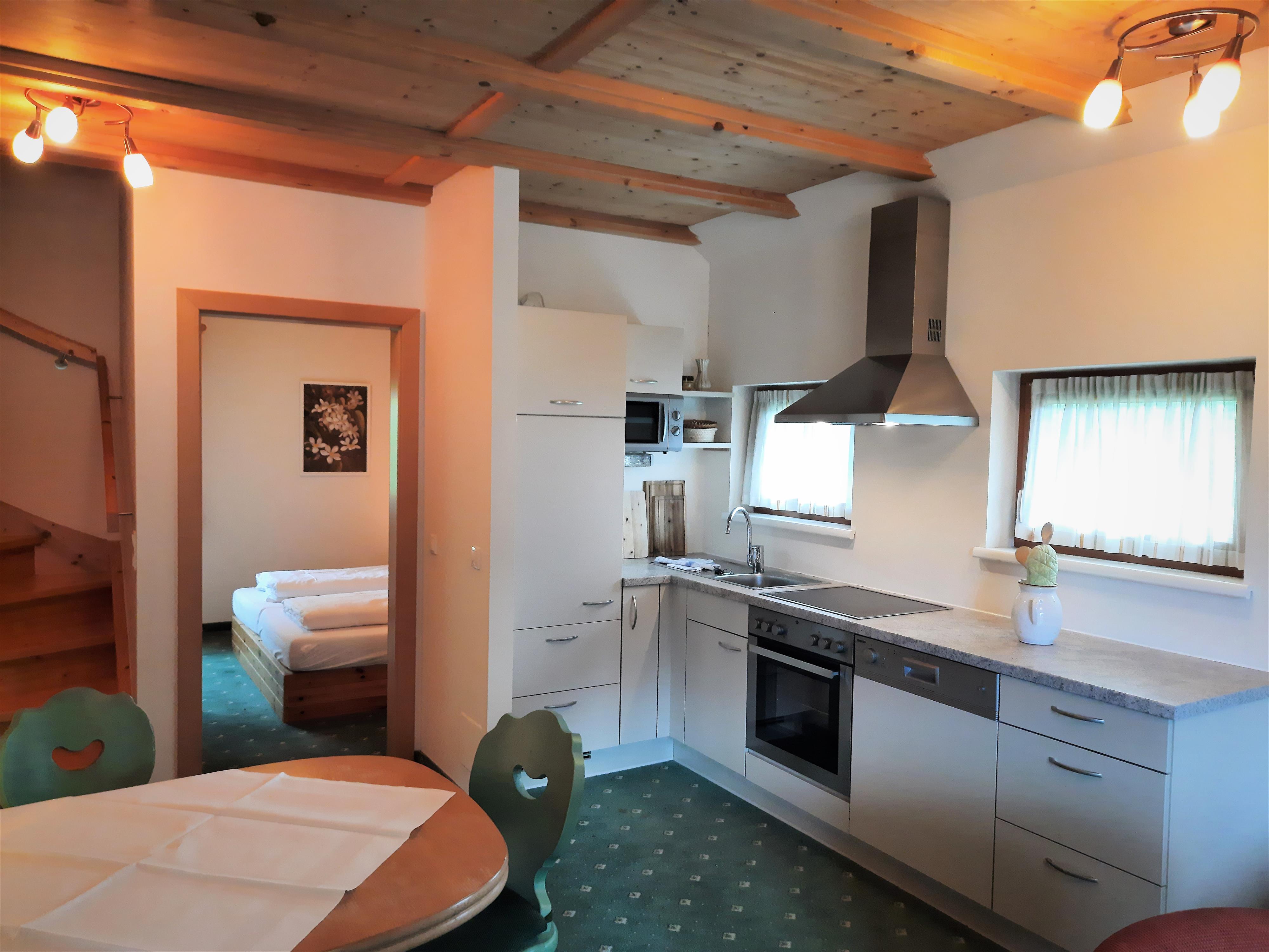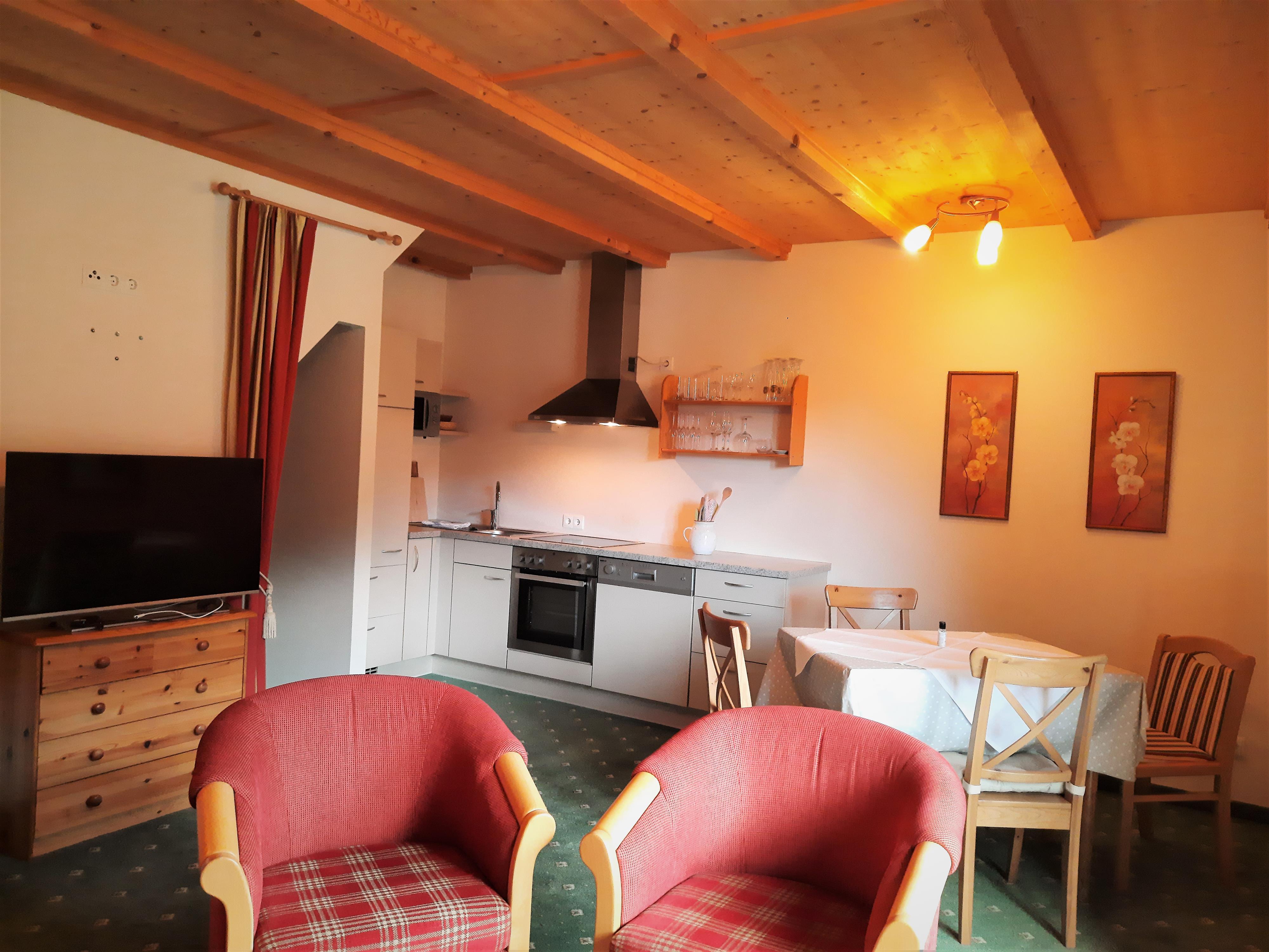 Das zweistöckige Appartement Top 3 verfügt über einen geräumigen Wohnbereich mit Südbalkon. Des weiteren befindet sich gleich anschließend die Küche mit Kühlschrank, Mikrowelle, Backofen und E-Herd sowie Spüle und Geschirrspüler und gemütlicher Sitzecke für bis zu 6 Personen.