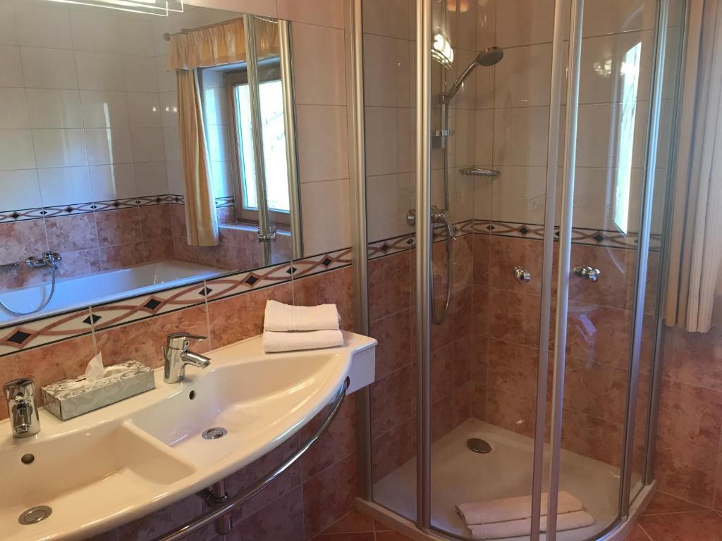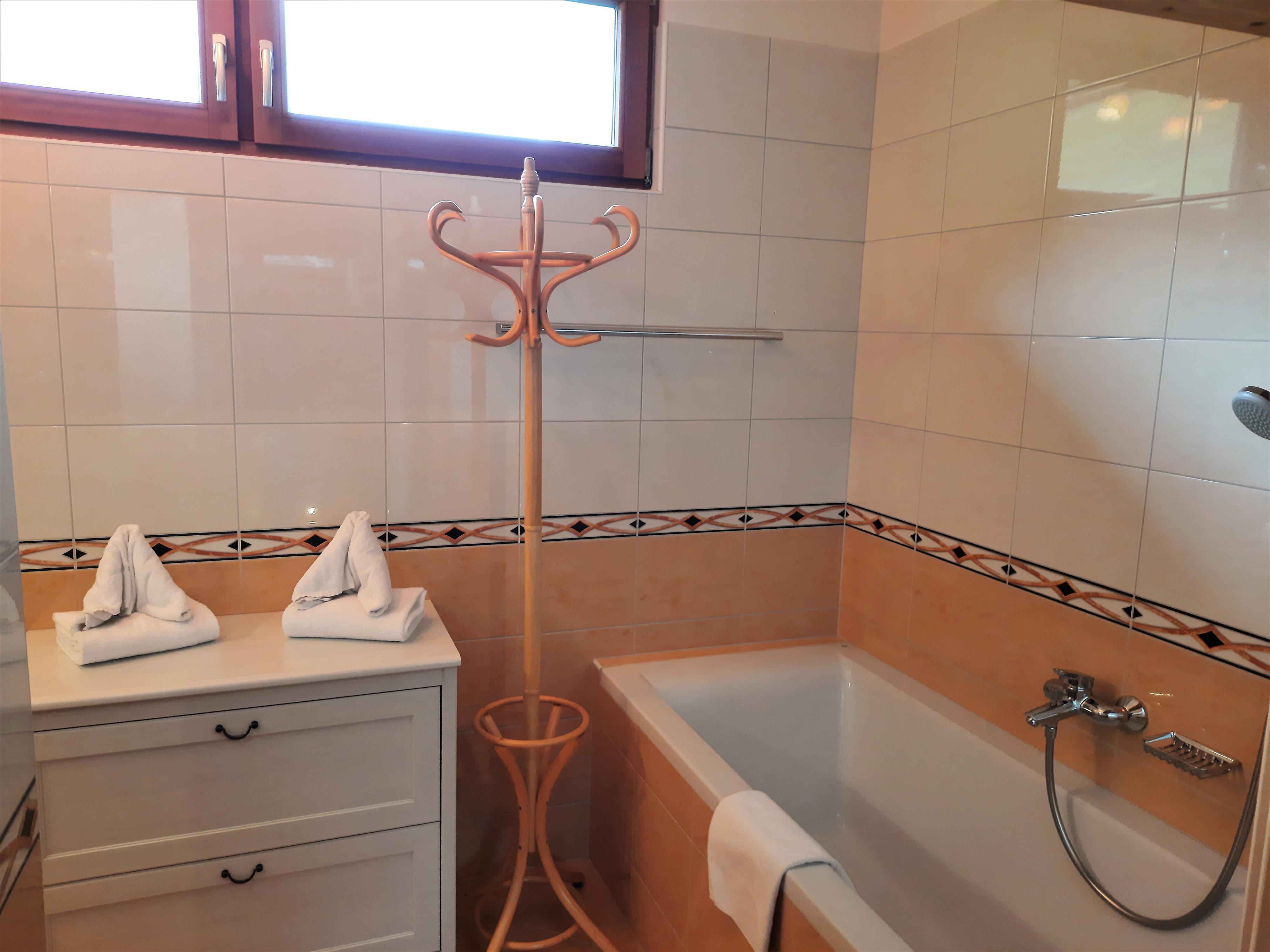Im Oberstock befinden sich 1 Elternschlafzimmer und 1 Kinderschlafzimmer, jeweils mit eigenem Südbalkon sowie einem großzügigen Badezimmer mit Doppelwaschbecken und Dusche, Badewanne und WC separat. Eine weitere Toilette mit Bidet und Waschbecken befindet sich im Erdgeschoss.
