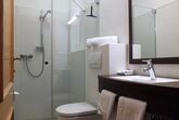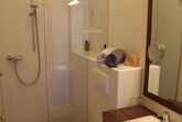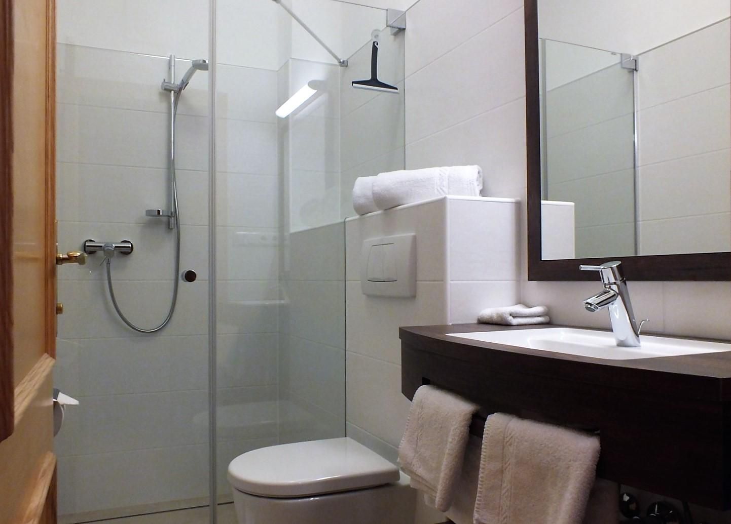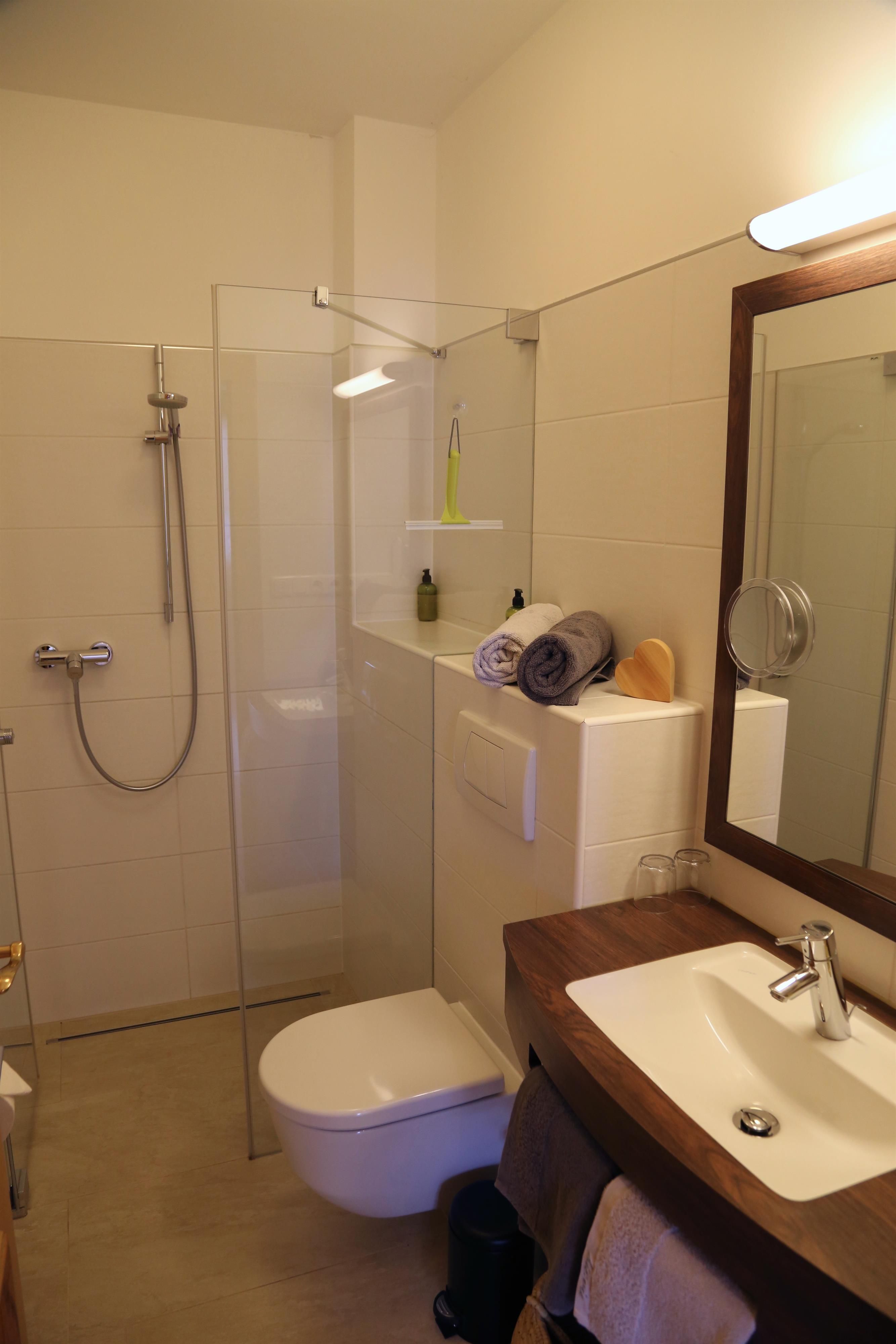 neues Bad mit Dusche, Waschbecken, WC und Föhn.