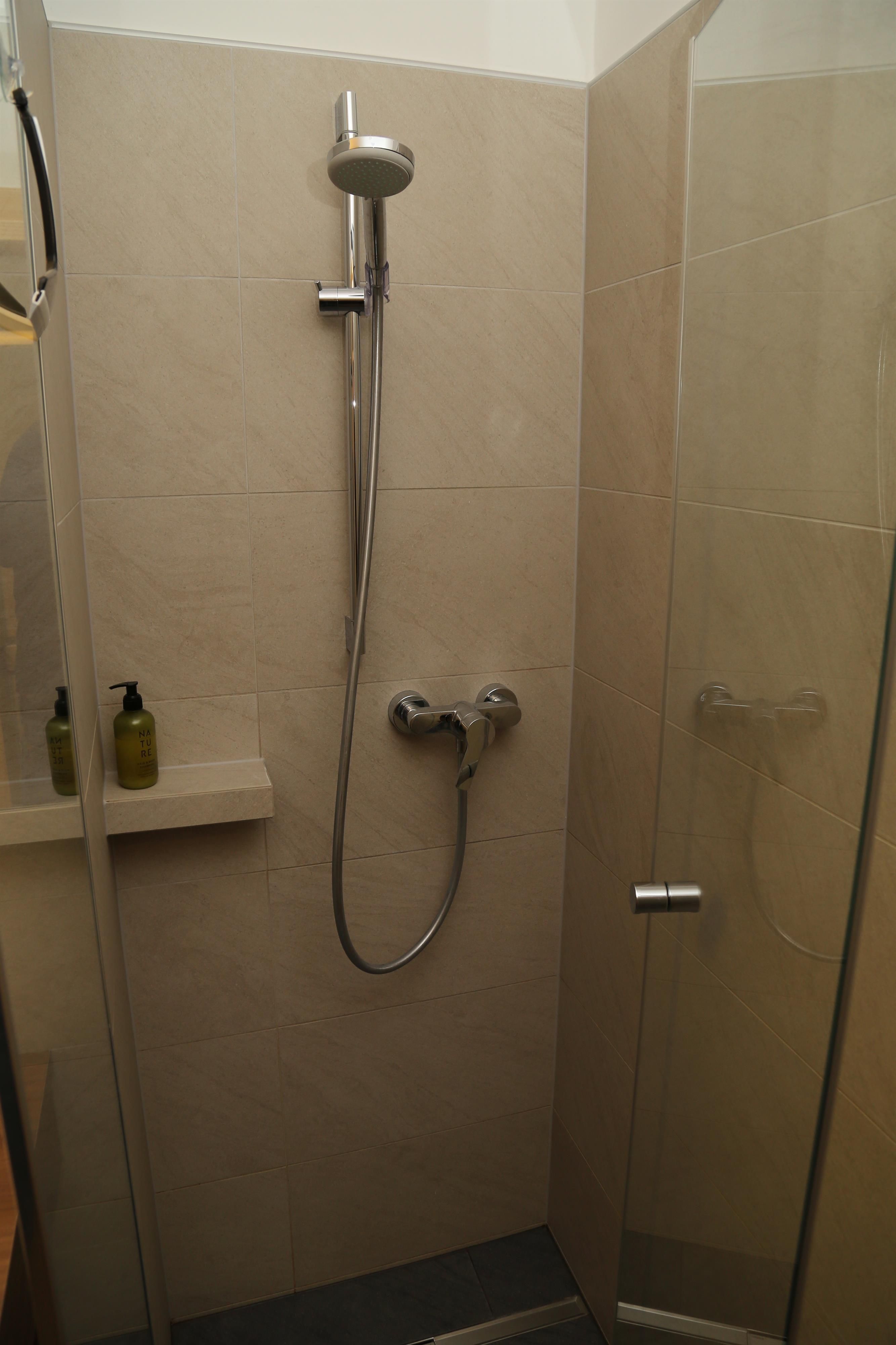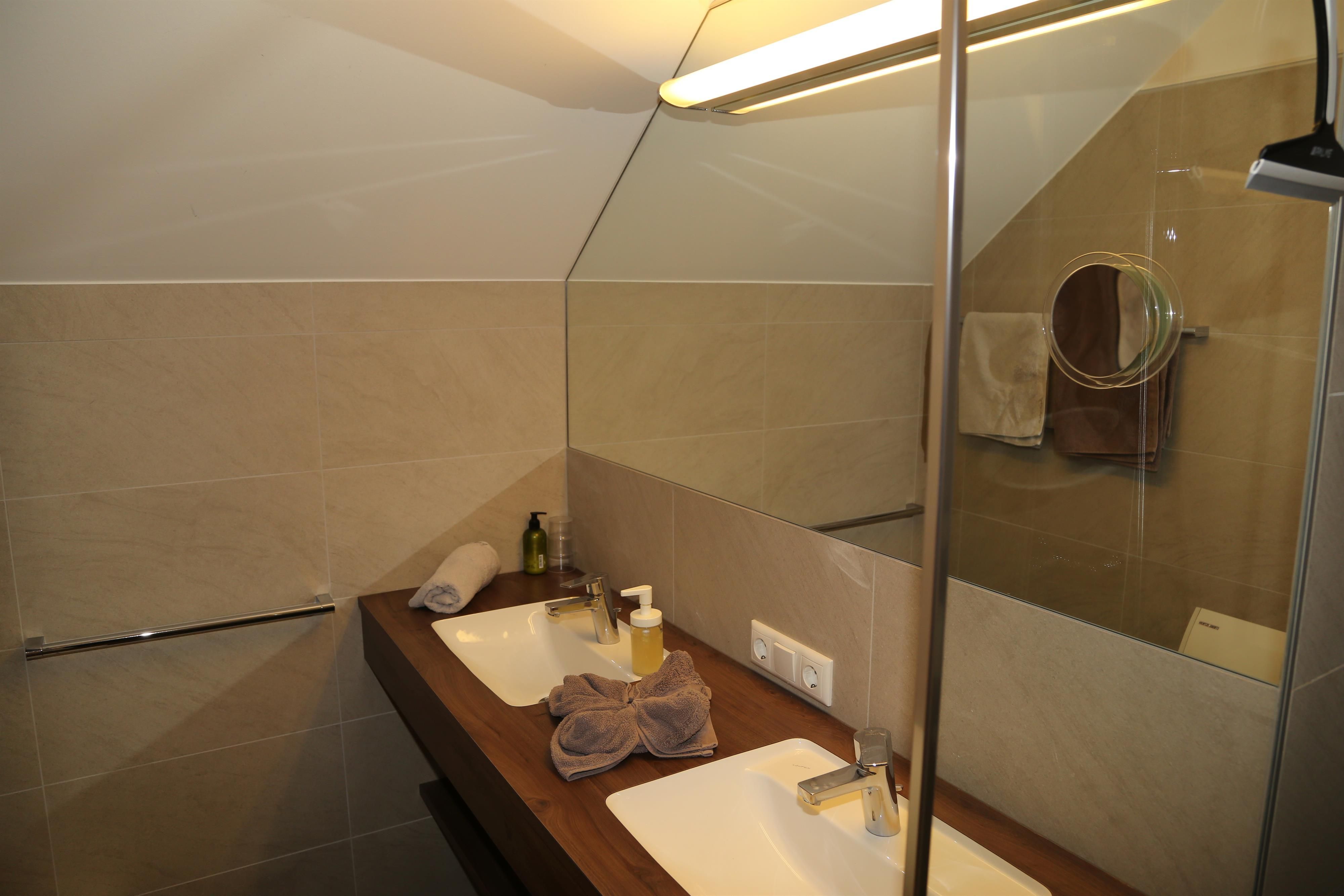 Bad mit Doppelwaschbecken, Dusche und Föhn, separates WC.