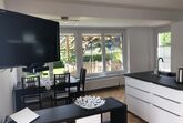 Die Küche ist voll ausgestattet inklusive einer Mikrowelle, einem Backofen und einem Geschirrspüler.