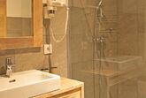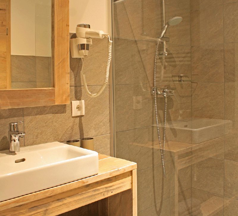 • Badezimmer mit bodenflacher Dusche, Toilette, Waschtisch und Föhn