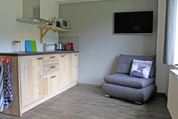 • Eine komplett eingerichtete offene Küche inklusive einer Nespresso Kaffeemaschine;