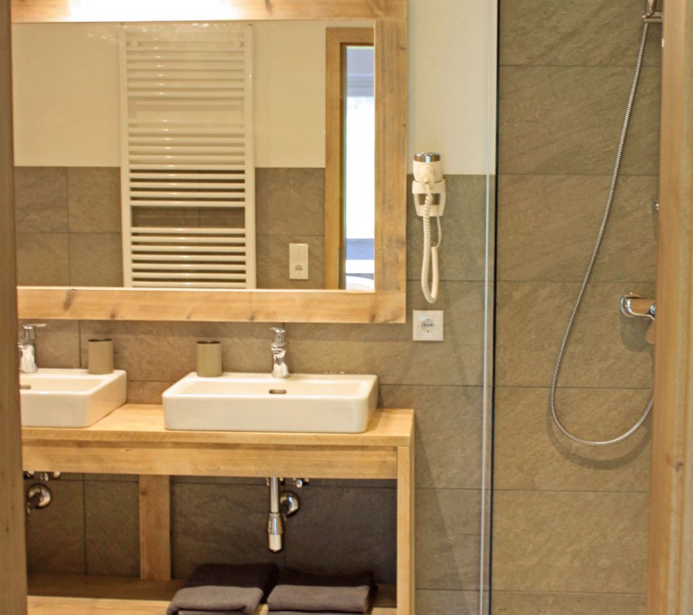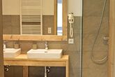 • Badezimmer mit bodenflacher Dusche, Bidet, Toilette, doppelter Waschtisch und Föhn