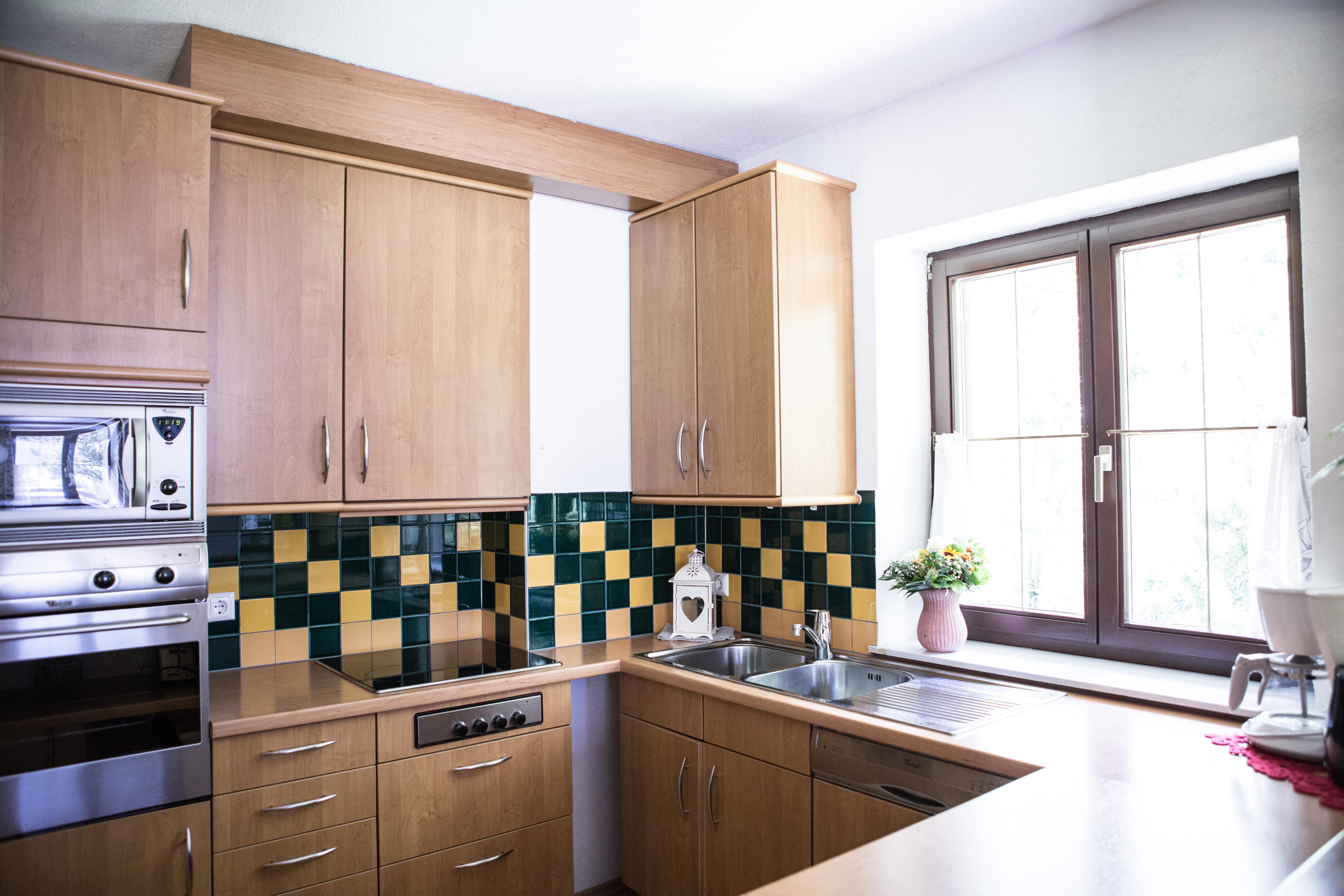• Küche mit Backofen, Cerankochfeld, Kühlschrank mit Gefrierfach, Geschirrspüler, Waschmaschine, Wasserkocher