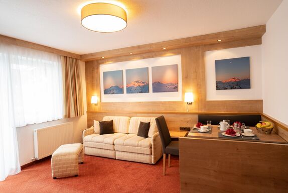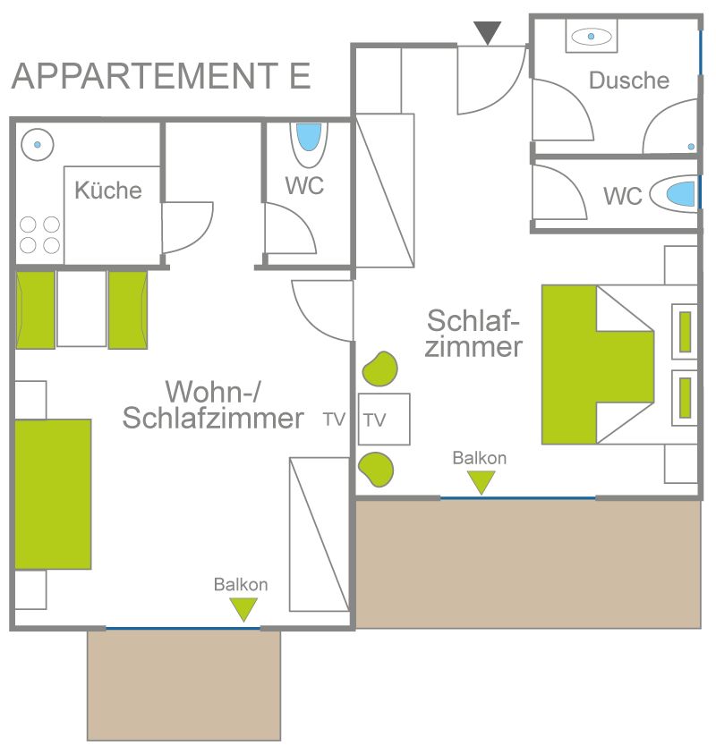 NEU ab Herbst 2020! Komfortables Appartement mit 1 Doppelzimmer mit großem Südbalkon, 1 Wohn- Schlafraum mit Ausziehcouch, Essbereich sowie ebenfalls Südbalkon, Küche mit Induktionsherd, Mikrowelle, Geschirrspüler, Kühlschrank mit Gefrierfach, Kaffeemaschine, Wasserkocher uvm; 1 Badezimmer mit Dusche und Haarfön, 2 separate WC; Vorraum. Größe ca. 42 m²