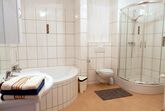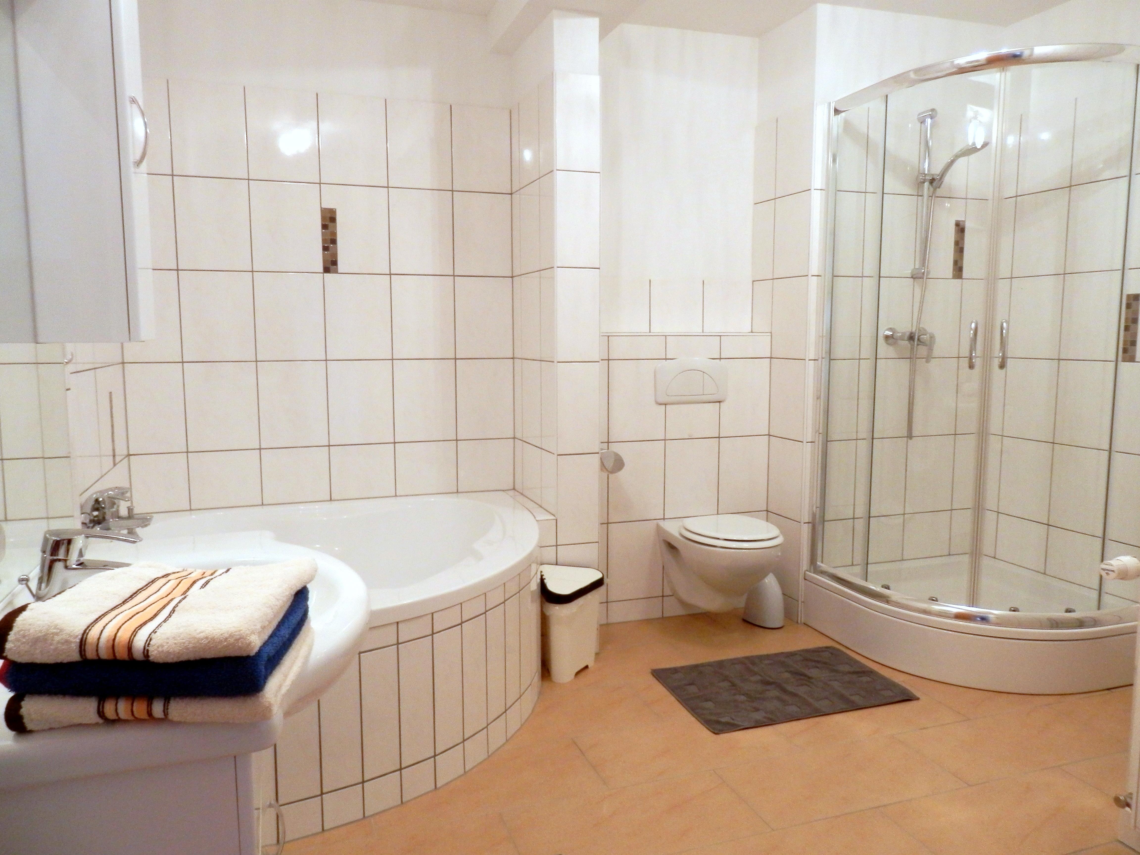 Schönes Bad mit Eckbadewanne, Dusche, Fön, Waschmaschine. Küche mit Geschirrspüler, Gefrierfach und Küchengeräten.