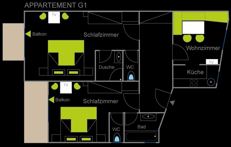 NEU ab Herbst 2020! Komfortables Appartement mit 2 Doppelzimmer mit je einem Südbalkon und je einem Badezimmer mit Dusche oder Badewanne und jeweils einem separaten WC, 1 Wohnzimmer (Essplatz und Sofa), vollausgestattete Küche (Kühlschrank mit Gefrierfach, Induktionsherd, Mikrowelle, Geschirrspüler, Kaffeemaschine, Wassserkocher); großzügiger Vorraum. Größe: ca. 64 m²