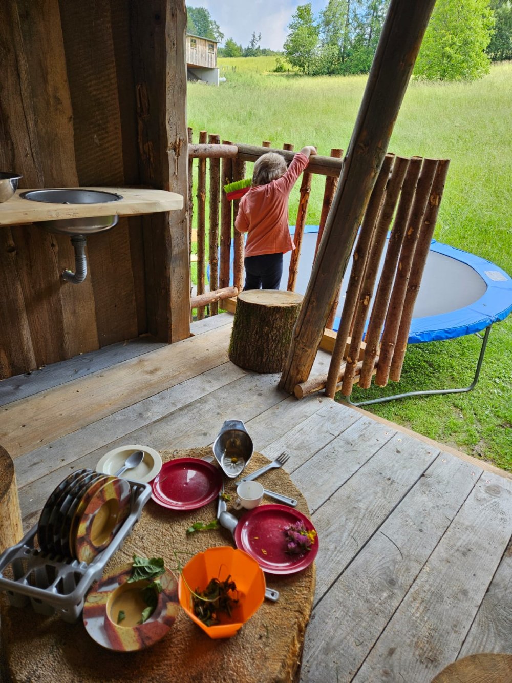 Im Sandkasten Burgen bauen, in der Vogelnestschaukel und auf der Rutsche den blauen Himmel und die Ferien genießen. Das Baum- und ein Rutschenhaus lässt Kinder Augen leuchten.