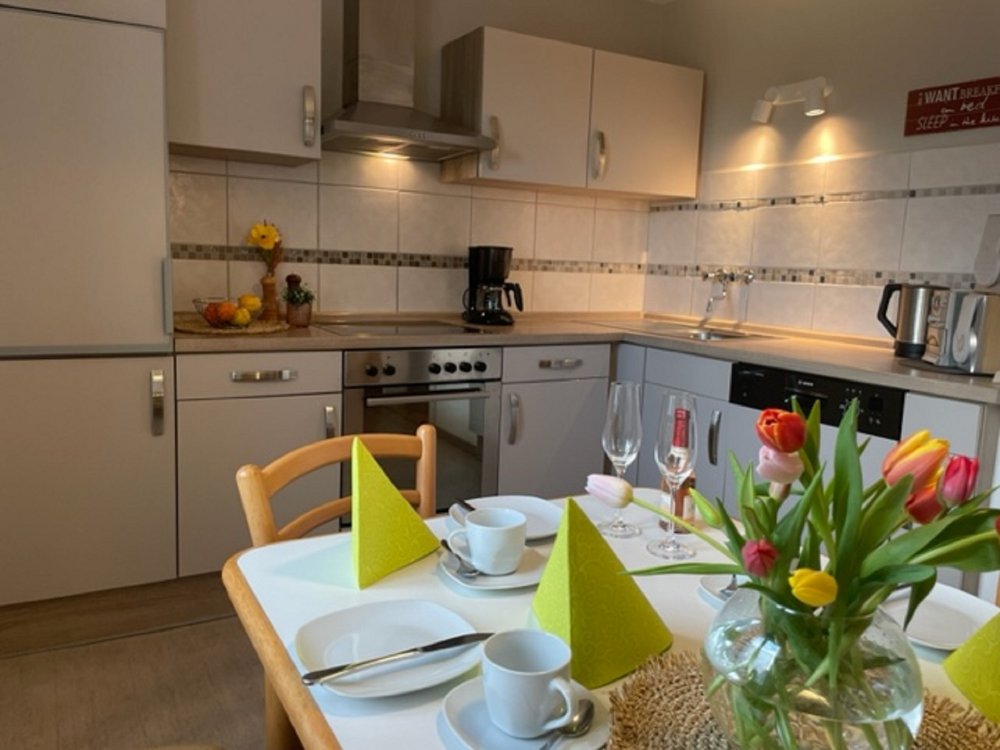 Schöne Wohnküche, großes Wohnzimmer mit Balkon, ein Doppelzimmer mit Zustellbett, ein französisches Bett (140 cm breit)für zwei Personen und ein Einzelzimmer, Dusche und seperates WC.