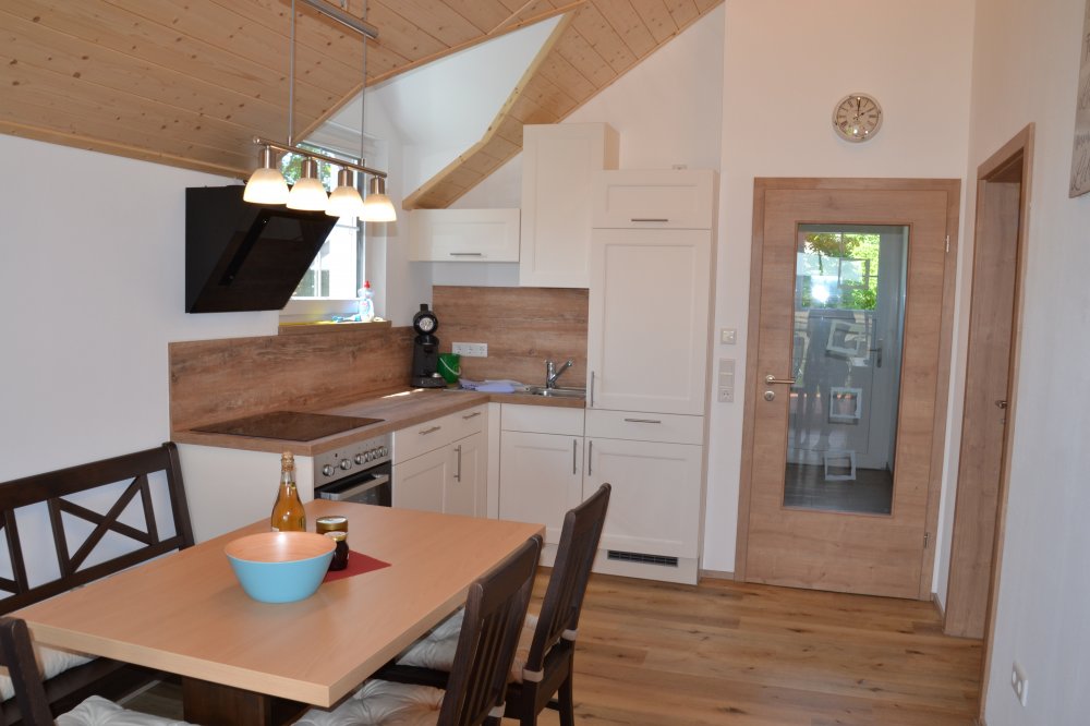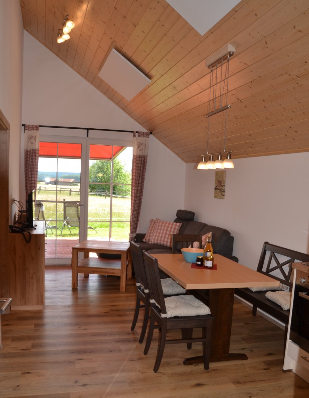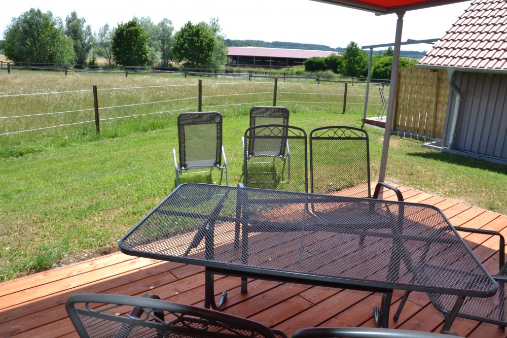 Zudem besteht das Ferienhaus aus einem Badezimmer mit Dusche, WC und Handwaschbecken und einer separaten Toilette mit Handwaschbecken. Die voll ausgestattete Küche mit Kühlschrank (mit Gefrierfach), Cerankochfeld, Backofen, Geschirrspülmaschine etc.... lässt nichts vermissen um es sich im Urlaub auch kulinarisch gut gehen zu lassen. Dieses Haus besitzt einen Wohn-Ess-Raum mit herrlichem Ausblick auf unsere Pferdekoppeln und unseren Weiher. Zudem bietet eine Holzterrasse hinter dem Haus mit elektrischer Markise ein wunderbares Urlaubsfeeling und ungestörte Erholung.