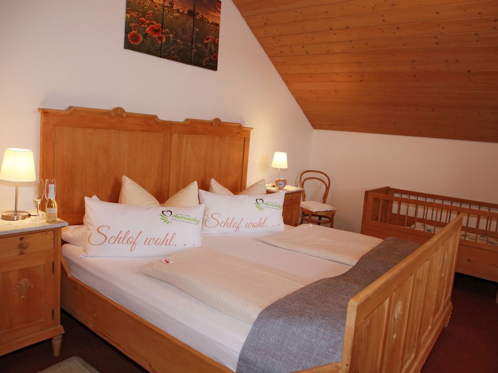 Kinderbettchen, Hochstuhl und Bettgitter sind vorhanden;