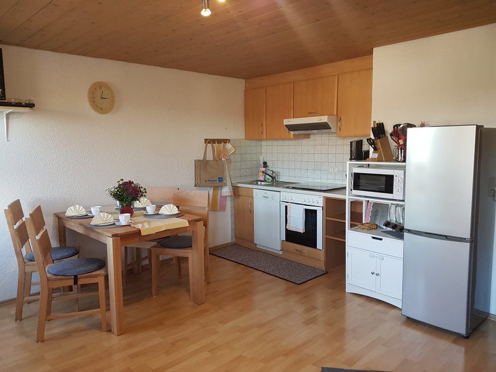 Wohnzimmer mit eingebauter Küche, mit Spülmaschine, Mikrowelle, Kaffeemaschine von Senseo oder Filterkaffeemaschnine, Milchaufschäumer für einen leckeren Capuccino oder Latte Macchiato, Soda-Stream, Rührgerät, Stabmixer, Toaster und Eierkocher;