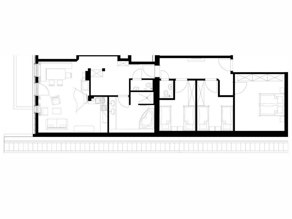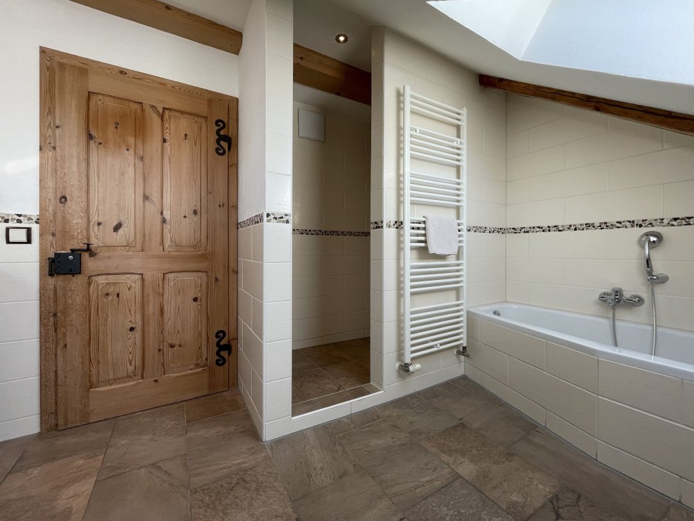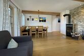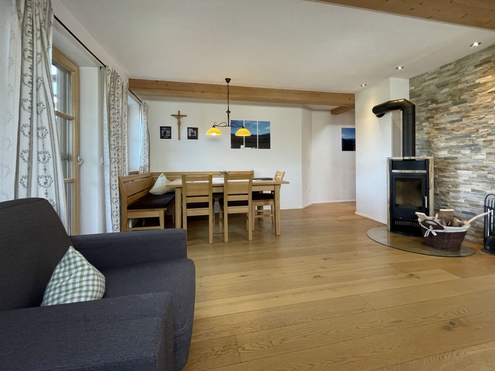 Ferienwohnung Kirschblüte: Wohnzimmer mit Holzofen, Küche, 3 Schlafzimmer, Bad mit Badewanne, und 2 WC. Sehr hell und schön. Im ländlichen Still eingerichtet