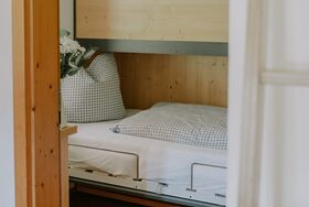 Unser kuscheliges Ferienhaus mit einem Schlafzimmer mit Doppelbett und einem kleinem Kinderzimmer,