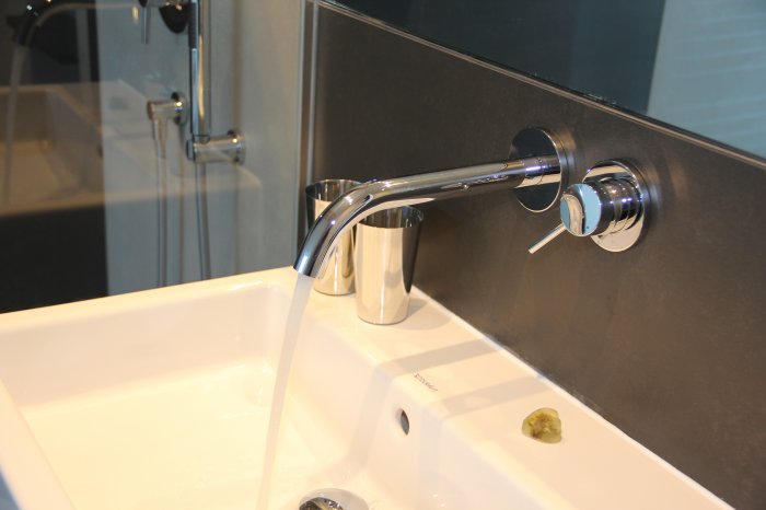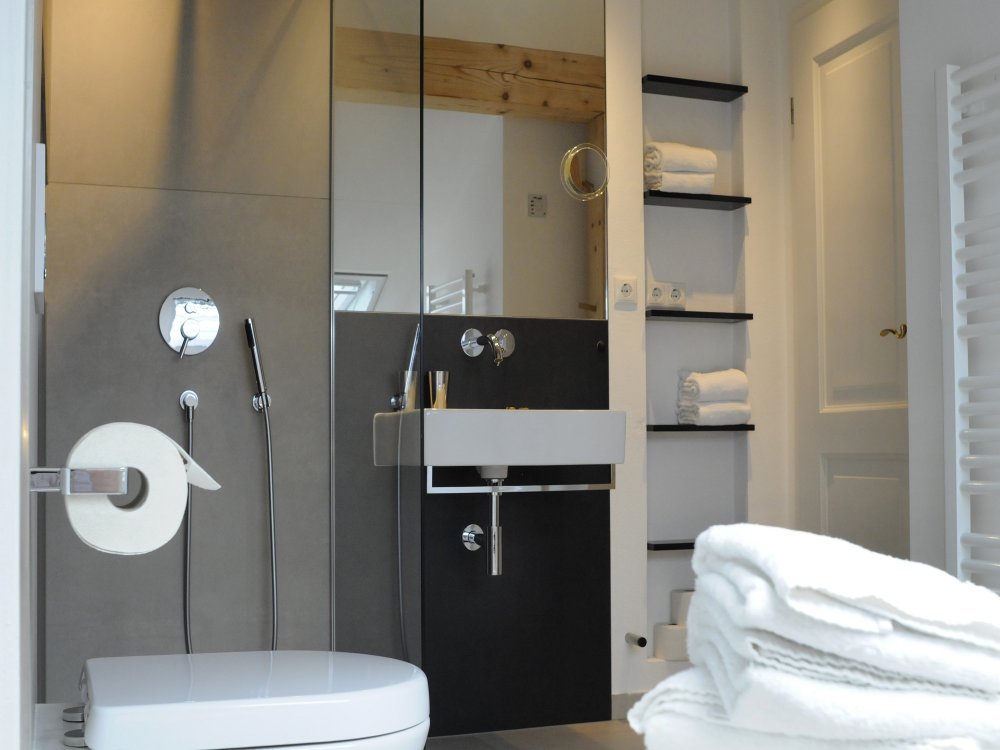 Im Badezimmer begrüßt Sie der Morgen durch das große Fenster und ist mit Regendusche, Glasabtrennung und WC ausgestattet.