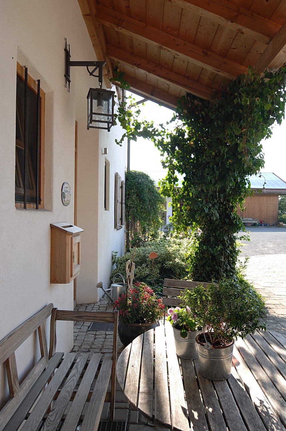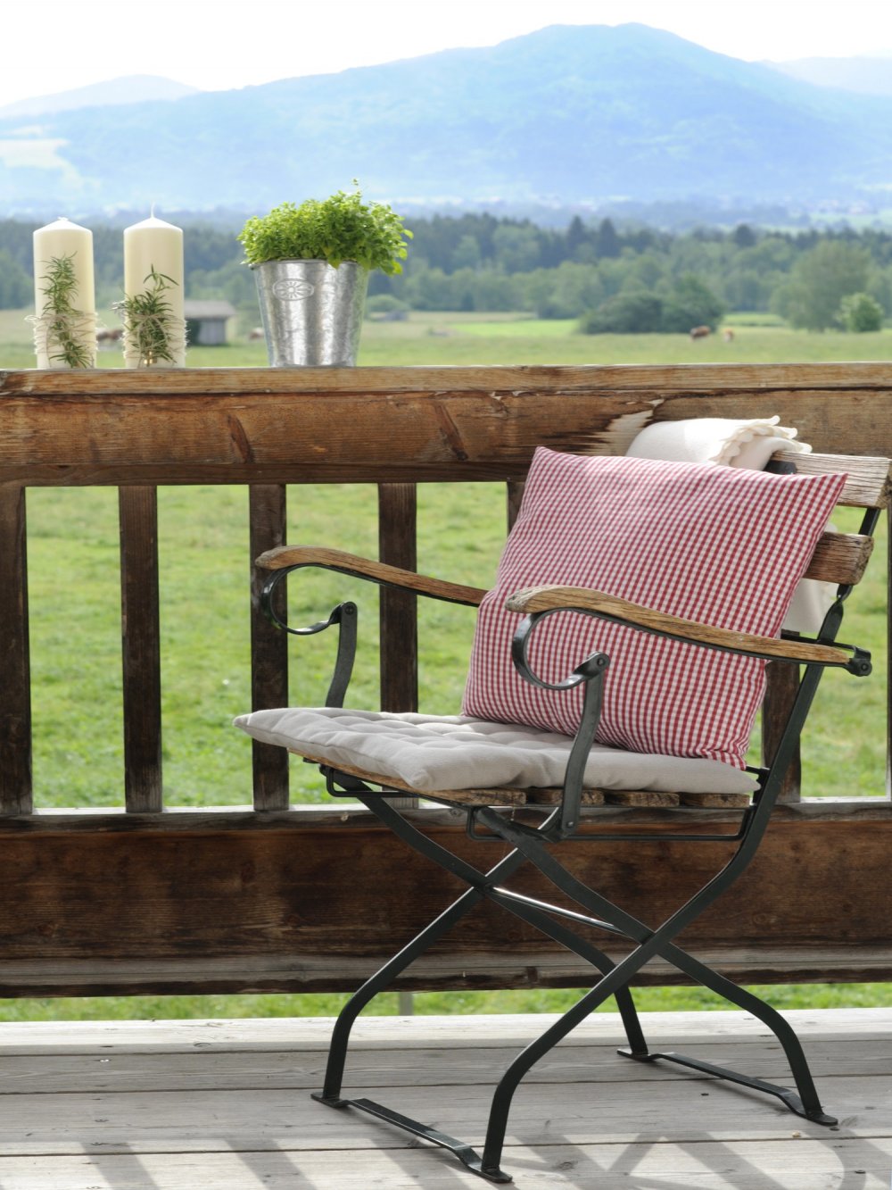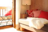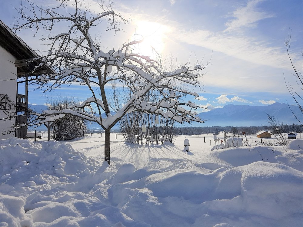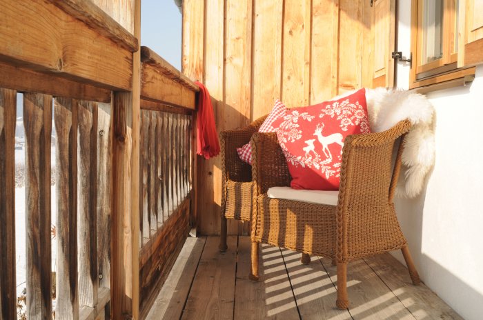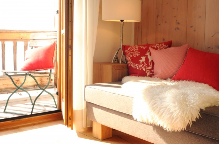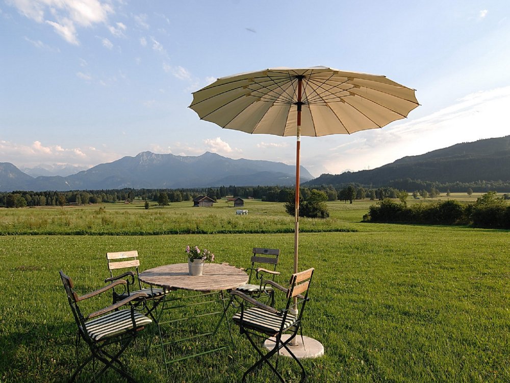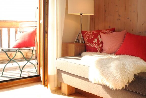 mit antikem Hochzeitsbett zum träumen. Auf dem Südbalkon den Sonnenauf- und Untergang genießen. Den Blick schweifen lassen, Gipfel an Gipfel bis zur Zugspitze.