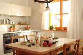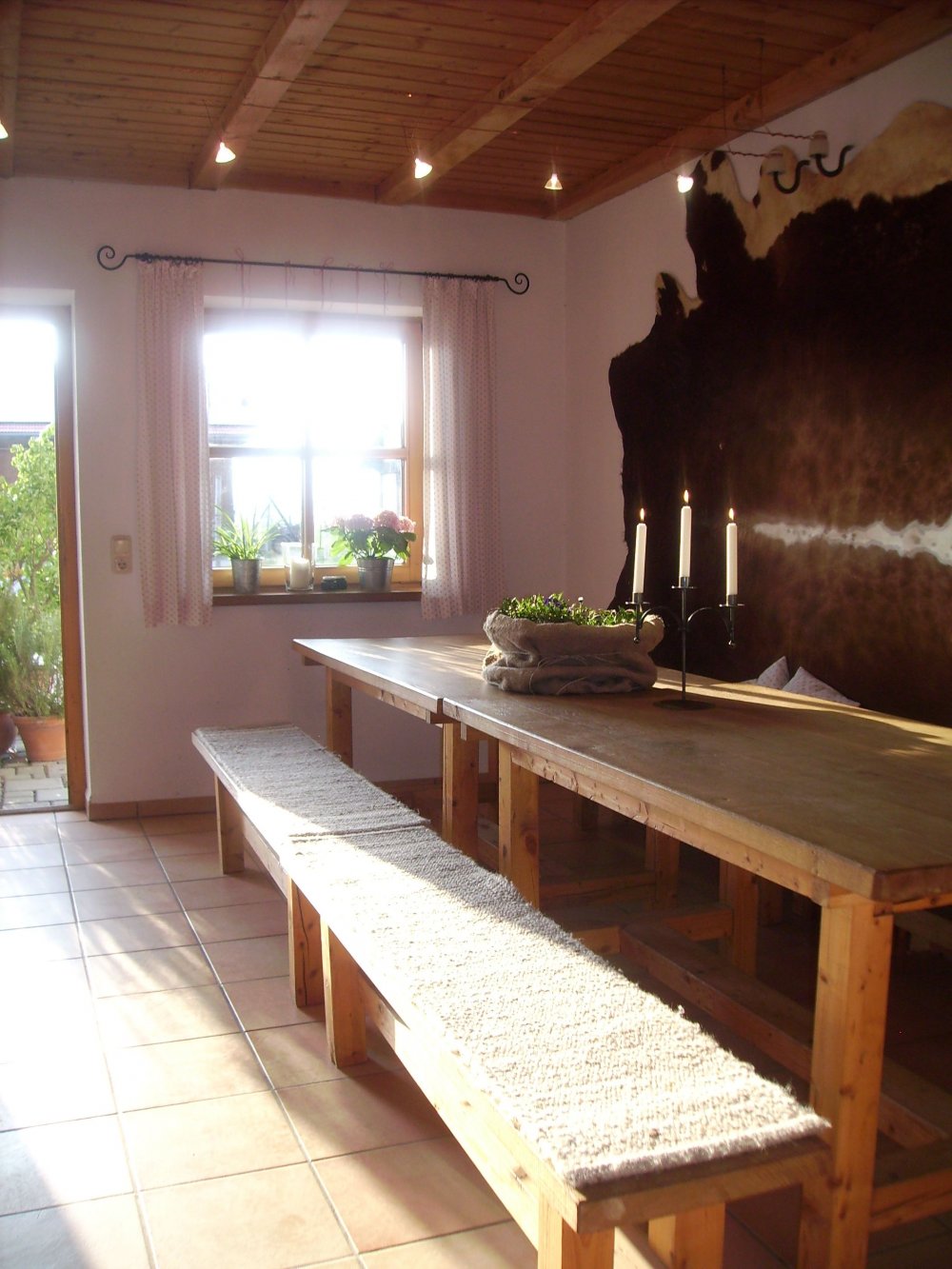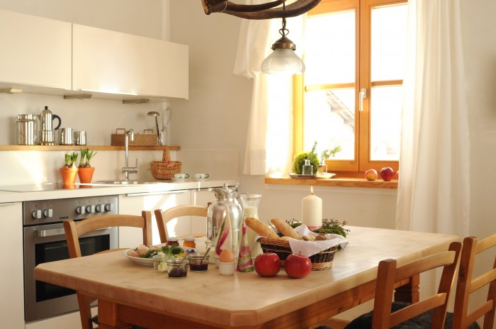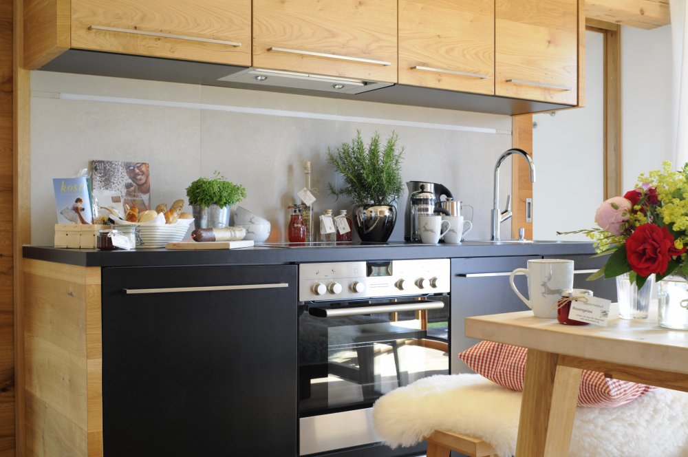 Der offene Wohn-Essraum ist lichtdurchflutet, mit einer voll eingerichteten Einbauküche, Vollholzmöbel und einem hochwertigen Lodendivan ausgestattet.