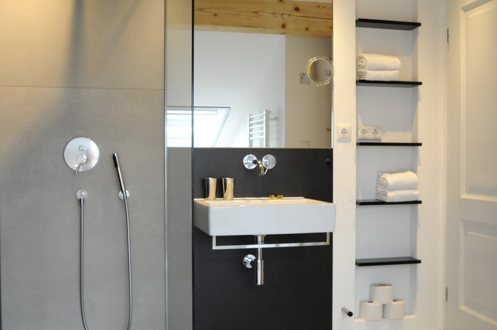 Im Badezimmer begrüßt sie der Morgen durch das große Fenster und ist mit Dusche, Glasabtrennung und WC ausgestattet.