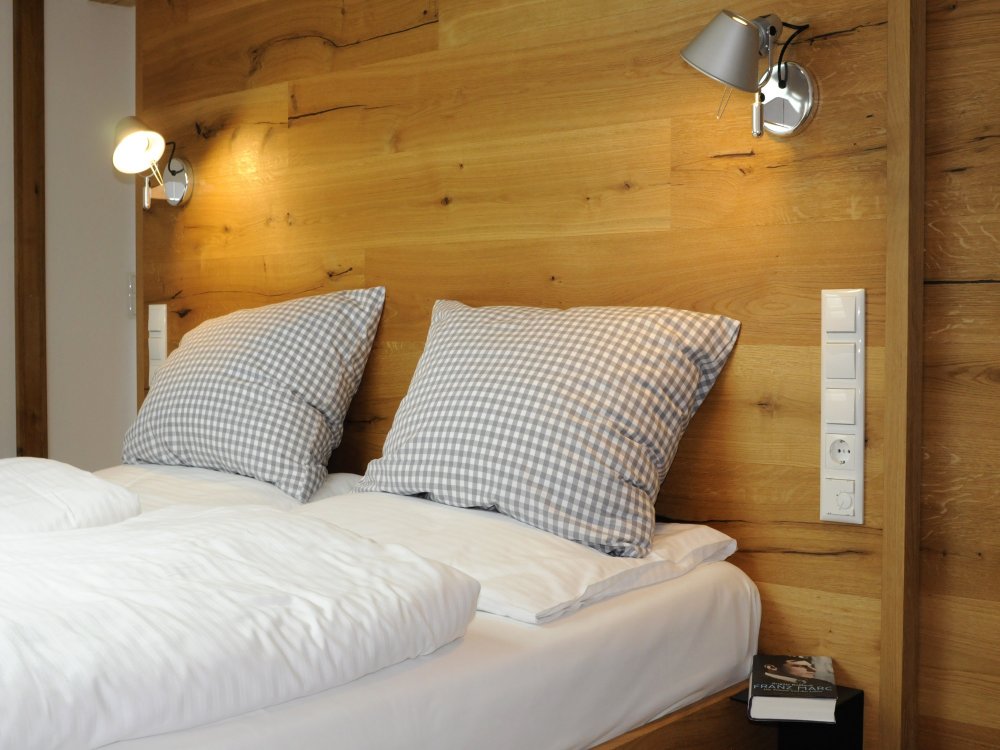 Ein Schlafzimmer ist mit einem hochwertigen Hochzeitsbett ausgestattet und das zweite Schlafzimmer mit zwei Einzelbetten, alles in geöltem Vollholz. Die Fensterläden können zum abdunkeln verwendet werden.