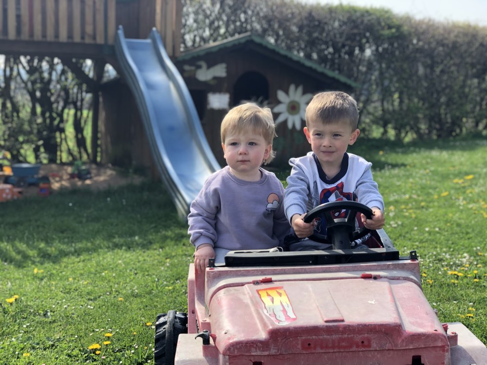 begeistert sein - mit Kettcar, Trettraktor oder Fahrrad ist man superflott auf dem Hof unterwegs. Und unsere