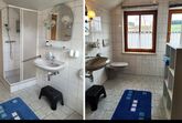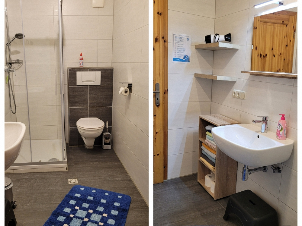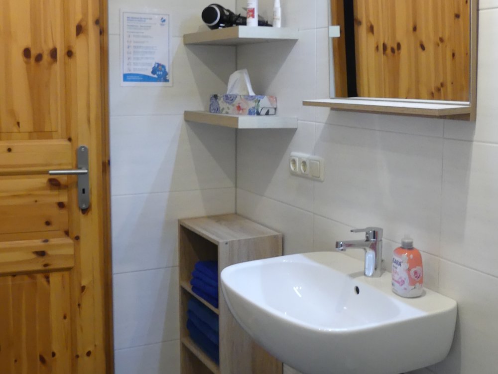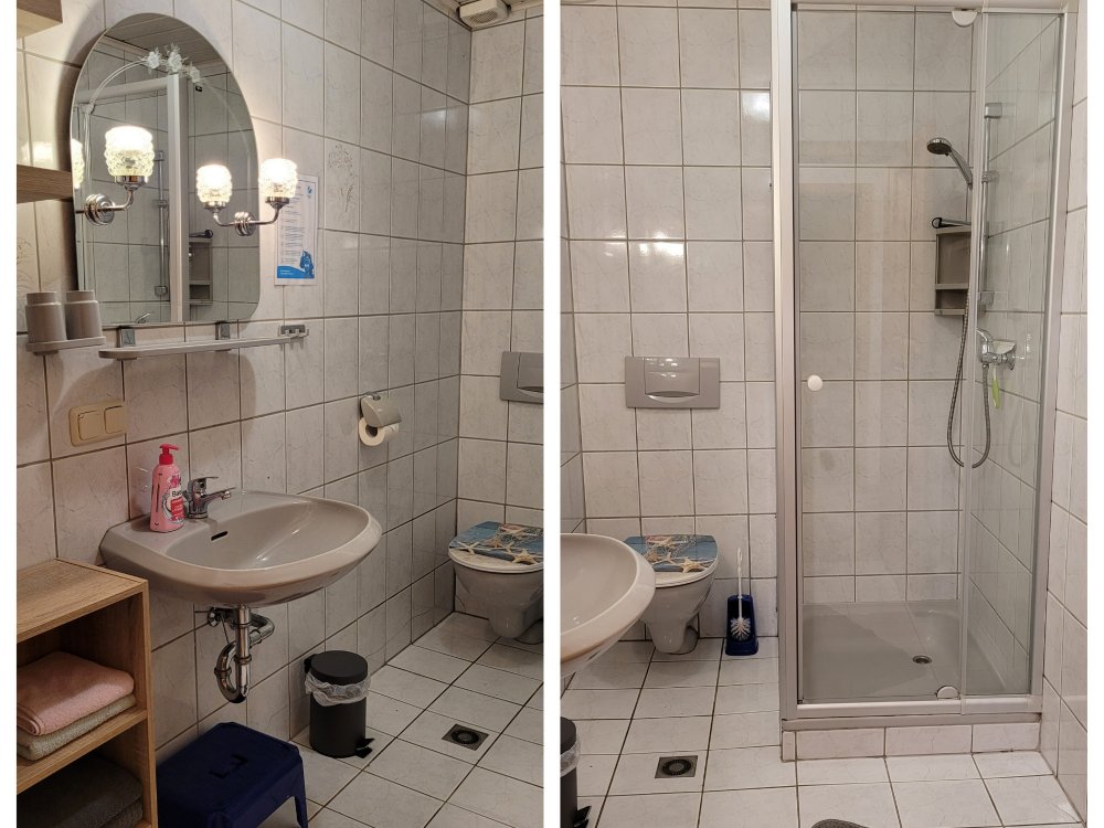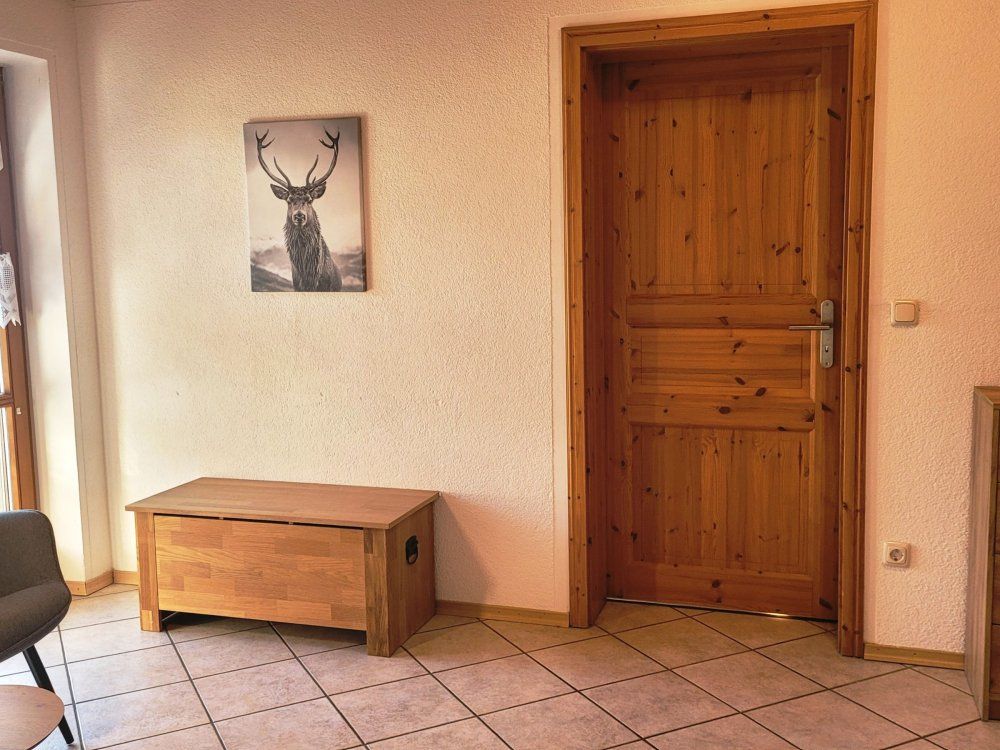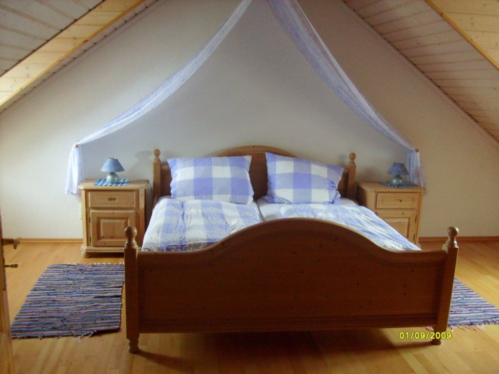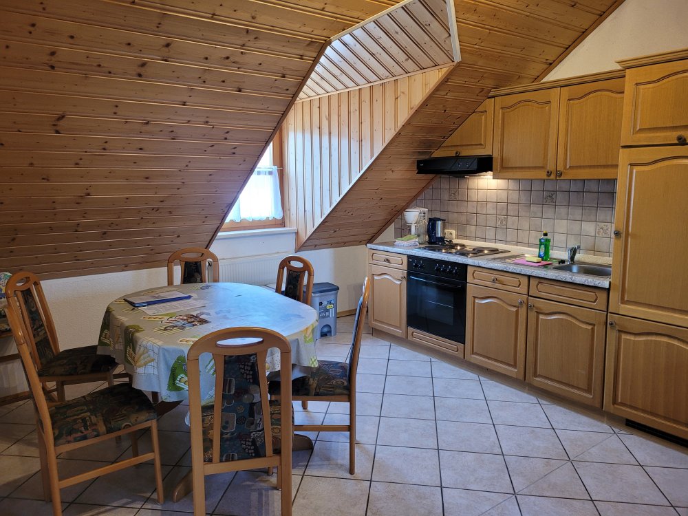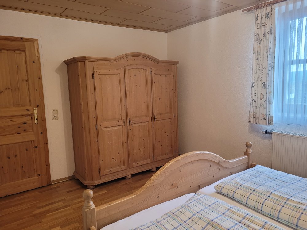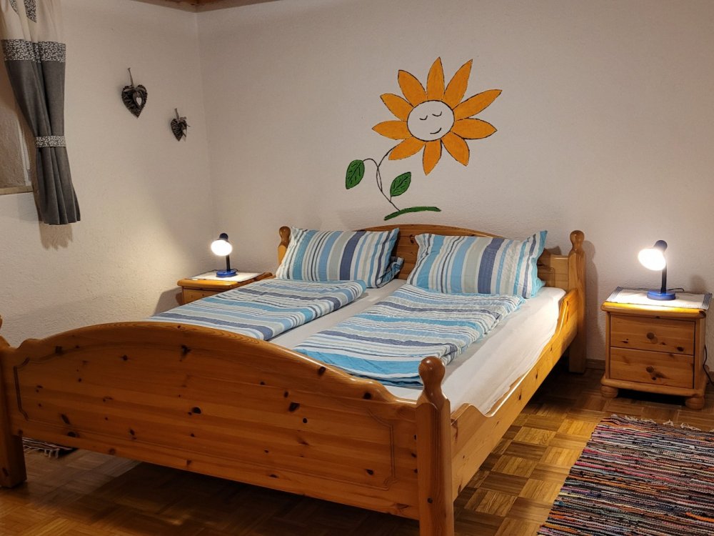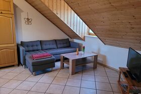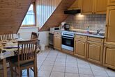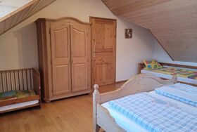 Gemütliche Ferienwohnung mit 1 Schlafzimmer, Wohnküche, Dusche, Balkon. Im Schlafzimmer Doppelbett, Einzelbett und Kinderbett.