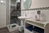 Badezimmer mit Dusche, WC, Waschbecken, Haarfön und Kosmetikspiegel