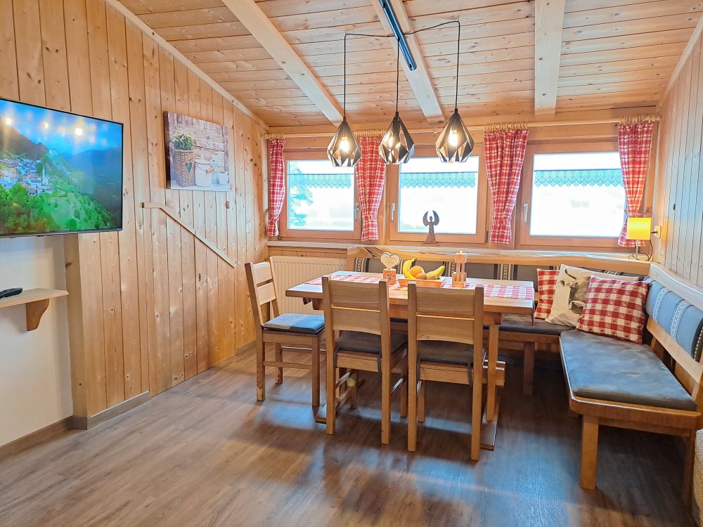 großzügige Wohnküche mit Küchenzeile, Eckbank, Sofa, Smart -TV und Musikanlage