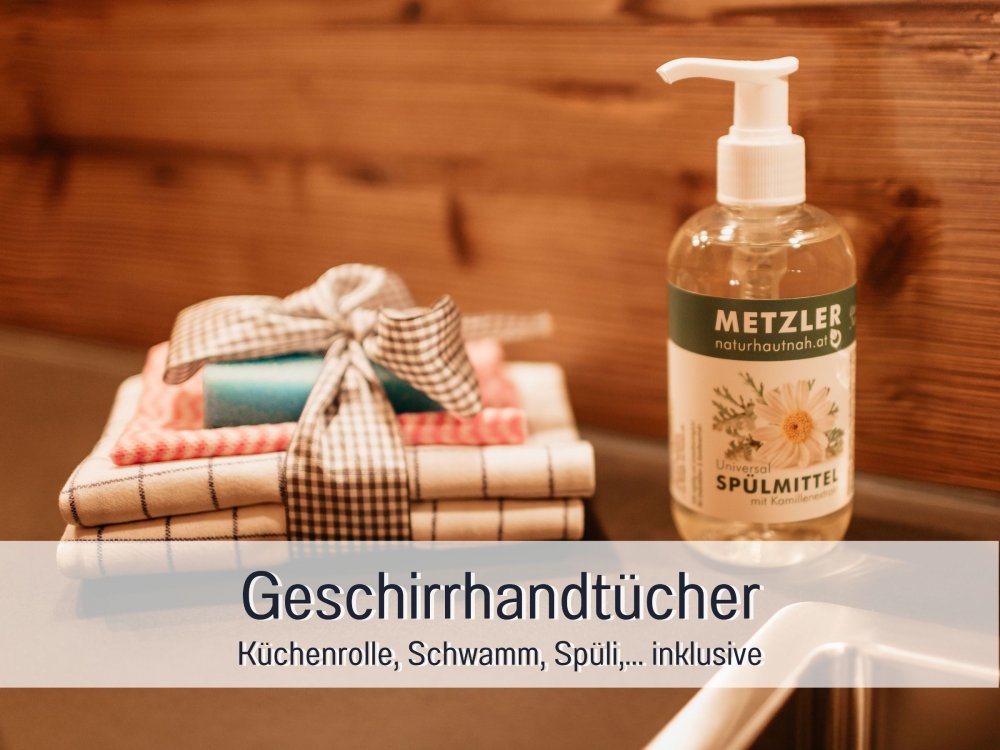 Spülmittel, Geschirrtücher und Spül-Schwämmchen stehen zur Verfügung