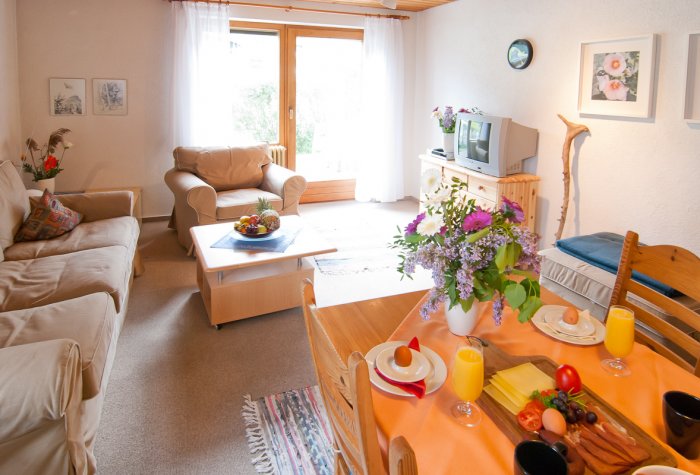 Neben Wohnzimmer mit Esstisch und Polstersitzgruppe (zusätzliche Schlafmöglichkeit auf Anfrage) steht Ihnen ein Schlafzimmer mit einem Einzelbett sowie Dusche/WC zur Verfügung.