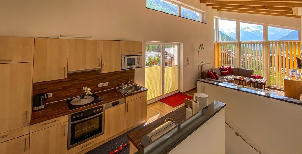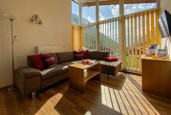 Das Appartement für 2–6 Personen (ca. 70 m²) verfügt über zwei getrennte Schlafzimmer sowie zwei Badezimmer mit Dusche/WC. Bei einer Belegung mit 2 Personen steht standardmäßig ein Doppelzimmer und ein Badezimmer zur Verfügung. Auf Wunsch kann jedoch bereits ab 2 Personen das zweite Schlafzimmer mit eigenem Badezimmer gegen Aufpreis hinzugebucht werden – für noch mehr Komfort und Privatsphäre. Eine voll ausgestattete Wohnküche (Cerankochfeld, Mikrowelle, Backofen, Kühlschrank, Spülmaschine, Kaffeemaschine, Wasserkocher u. v. m.) mit großer Wohnlandschaft bietet außerdem Schlafmöglichkeiten für die 5. und 6. Person. Das Bergpanorama der Ötztaler Alpen lässt sich auf der 40 m² großen, möblierten Dachterrasse genießen.